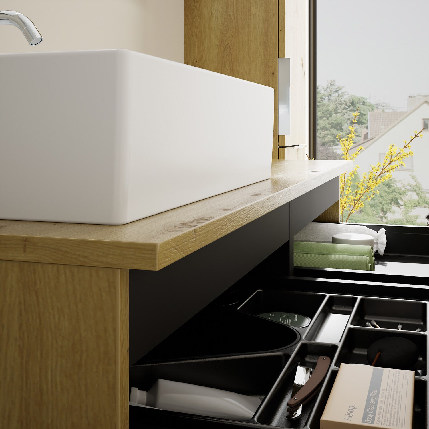- 2 Schubladen oben, 35 cm tief, mit Siphonausschnitt und Inneneinteilung