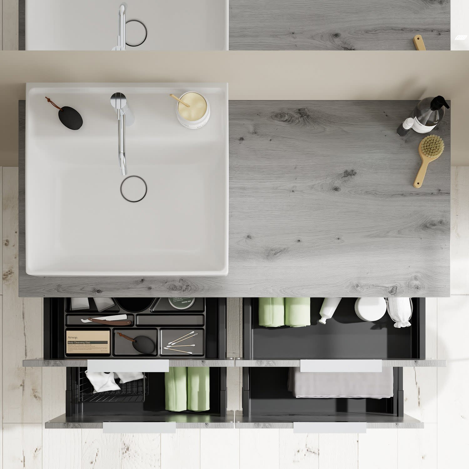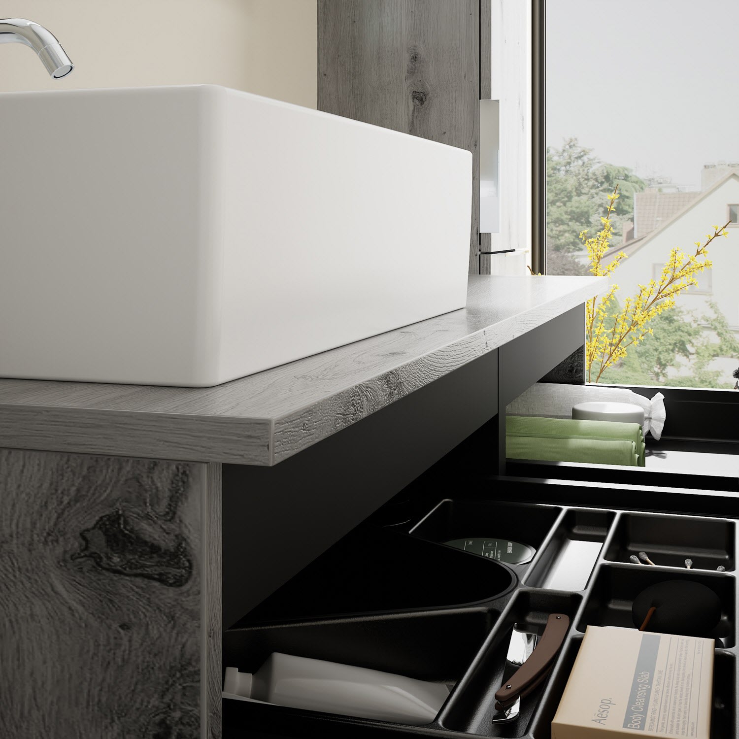 - 2 Schubladen oben, 35 cm tief, mit Siphonausschnitt und Inneneinteilung
