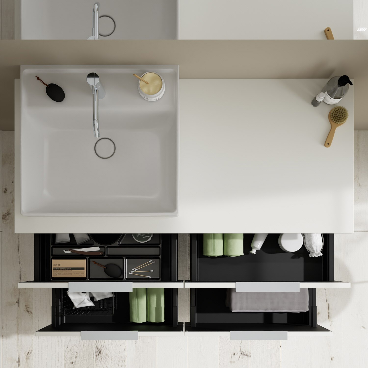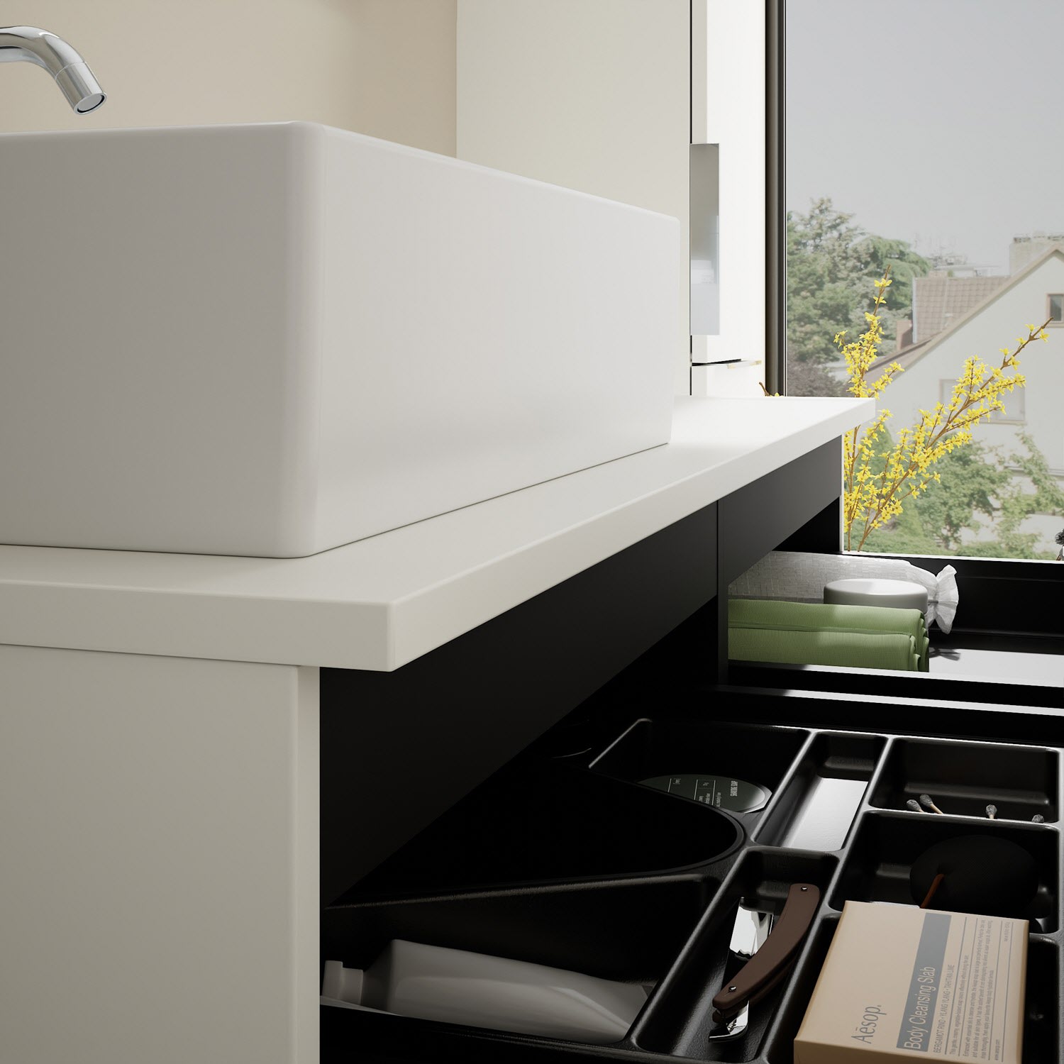 - 2 Schubladen oben, 35 cm tief, mit Siphonausschnitt und Inneneinteilung
