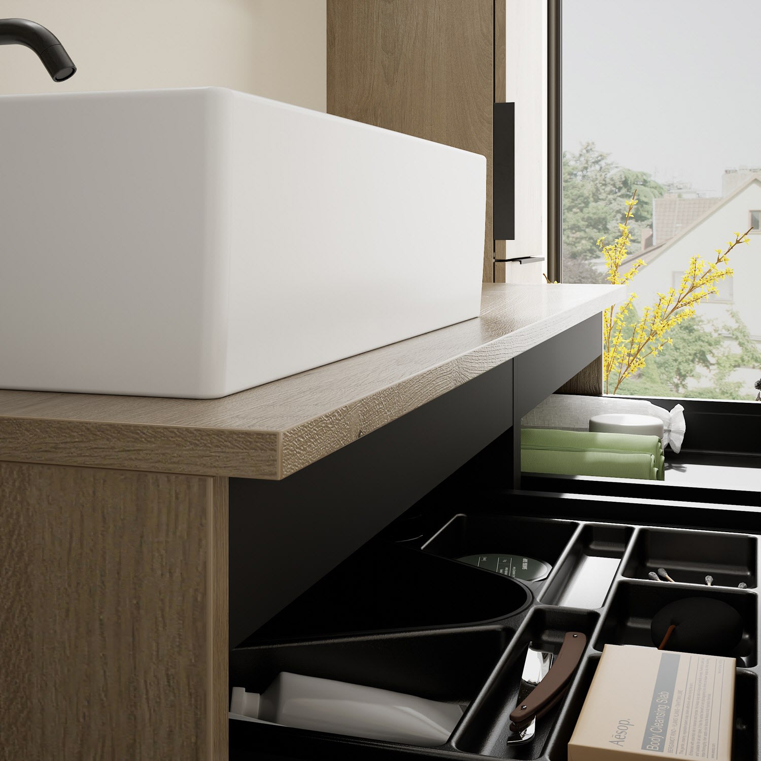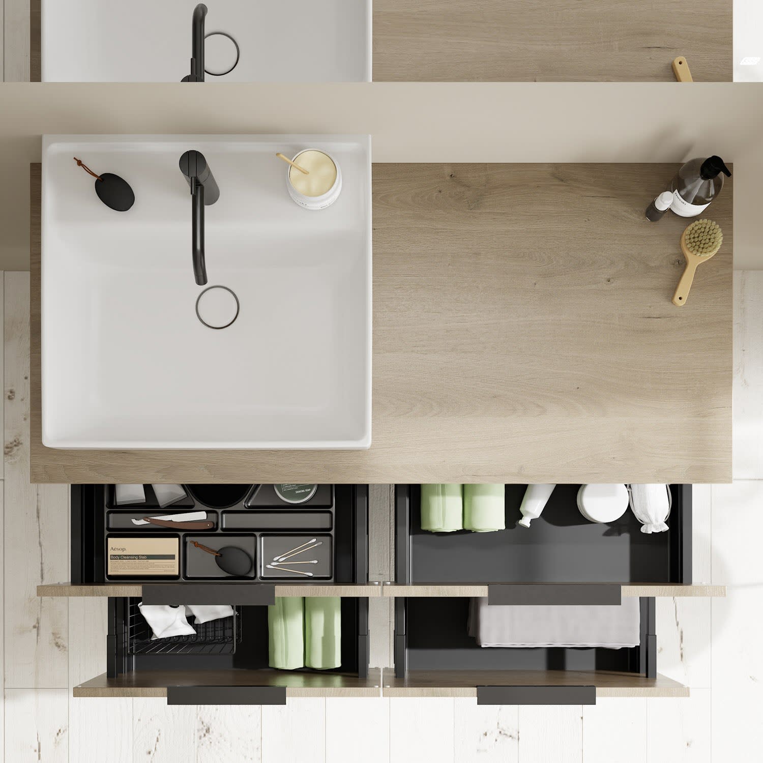 - 2 Schubladen oben, 35 cm tief, mit Siphonausschnitt und Inneneinteilung