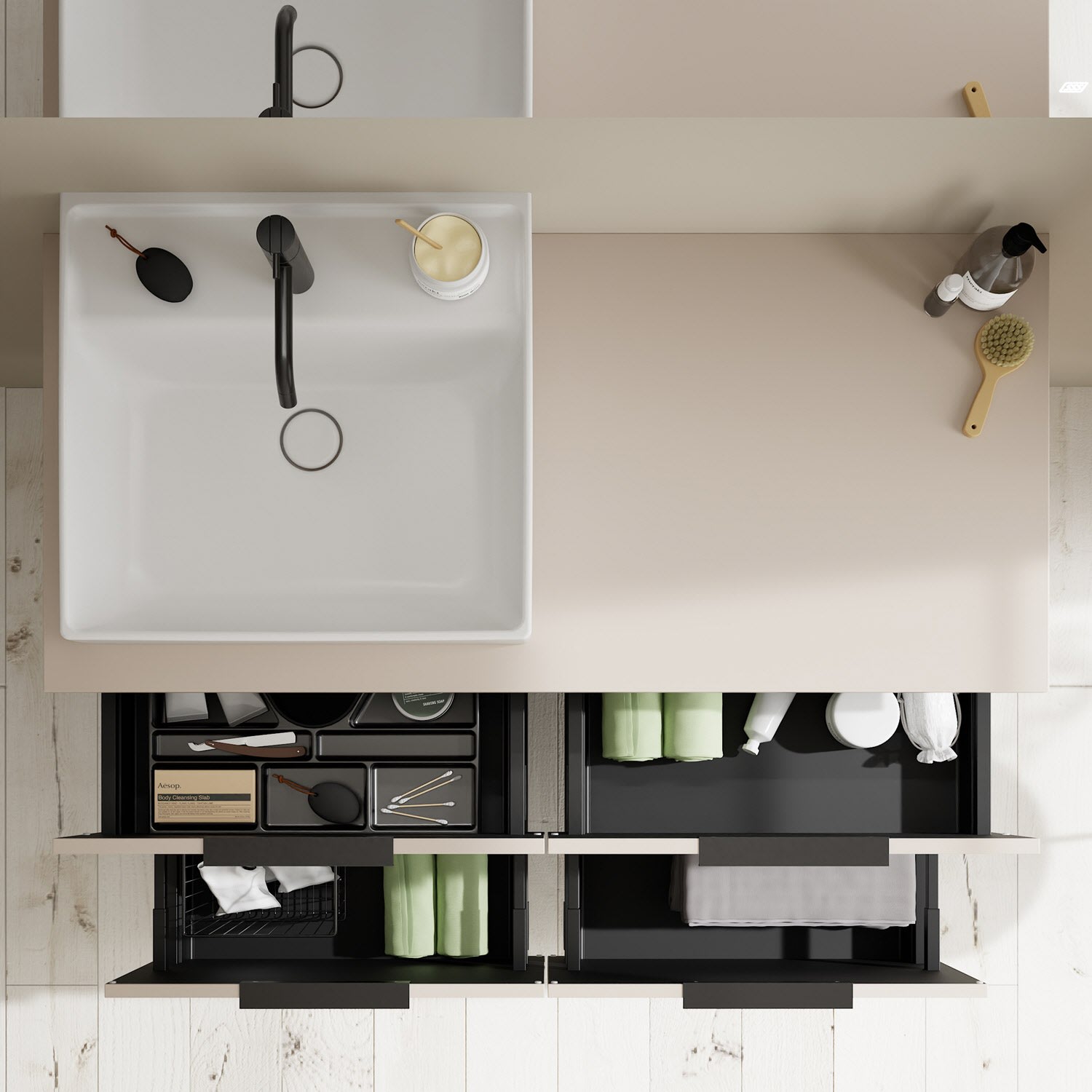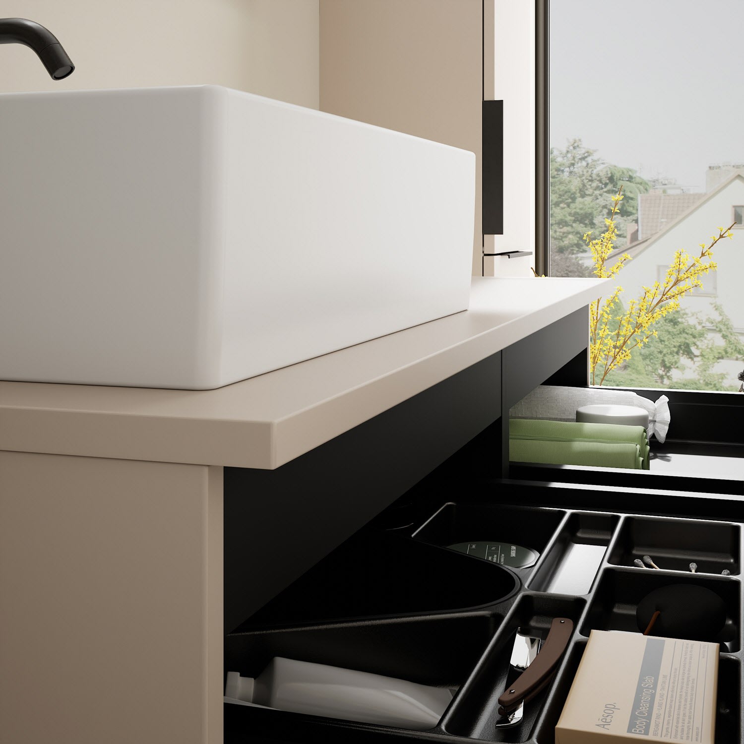 - 2 Schubladen oben, 35 cm tief, mit Siphonausschnitt und Inneneinteilung