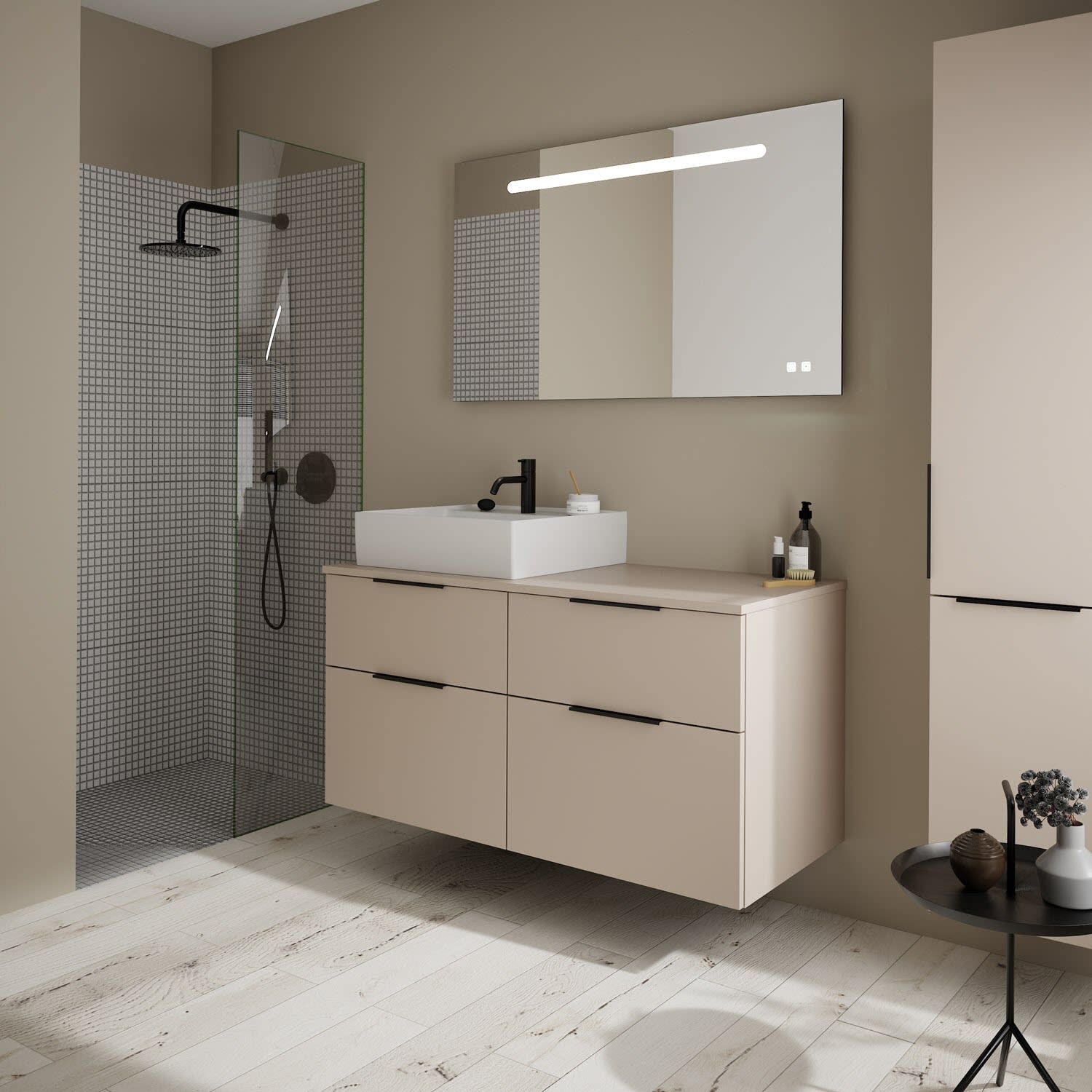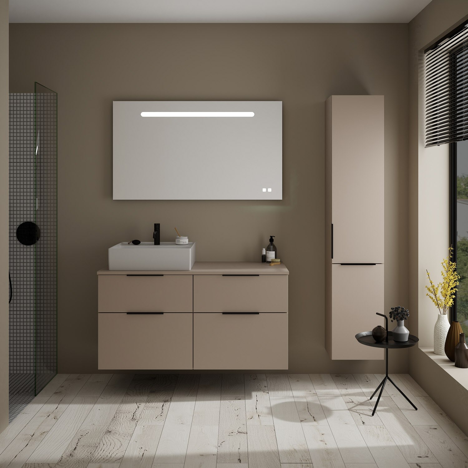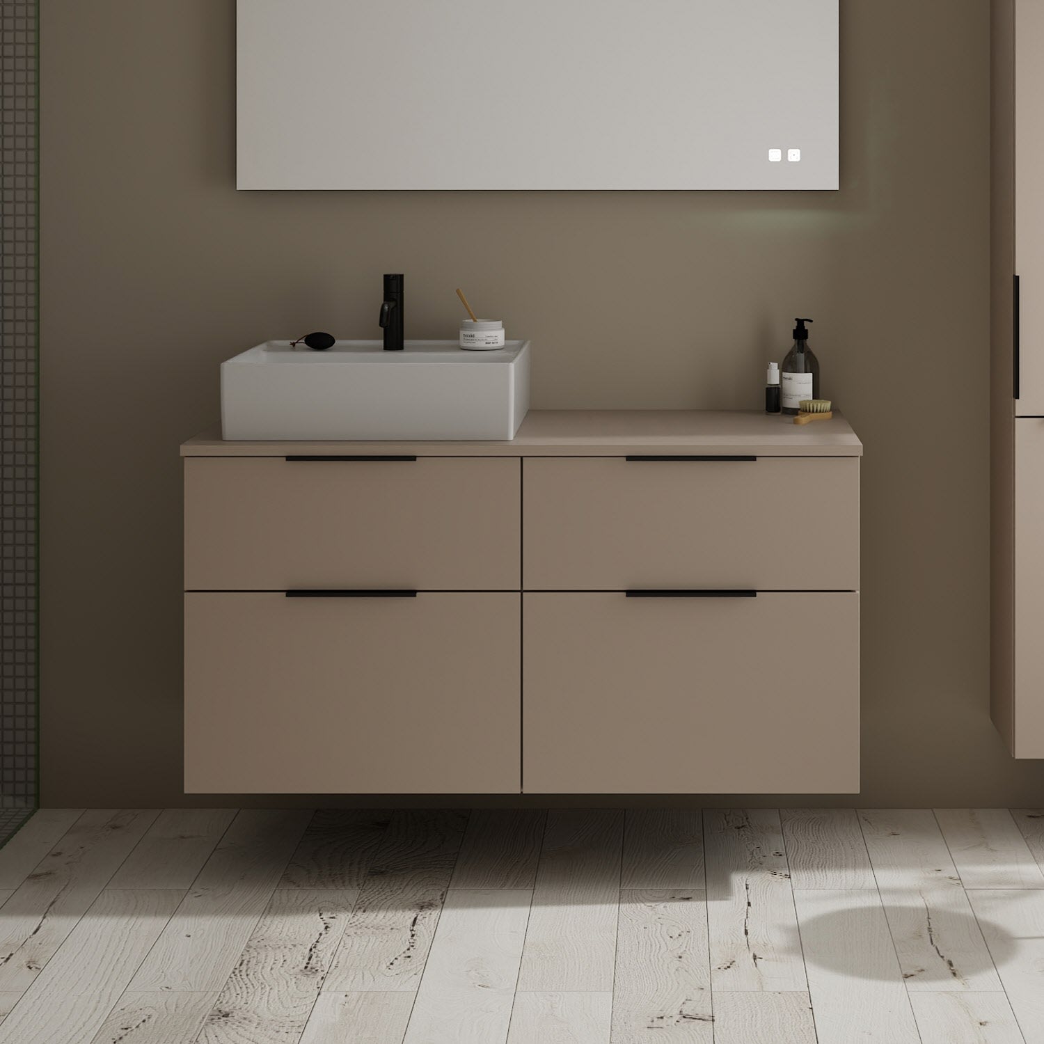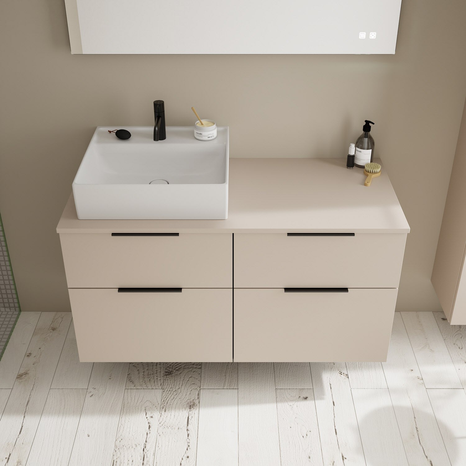 burgbad Eqio Waschtischkombination mit Keramik-Aufsatzwaschtisch 120 cm, links, mit Griff G0200