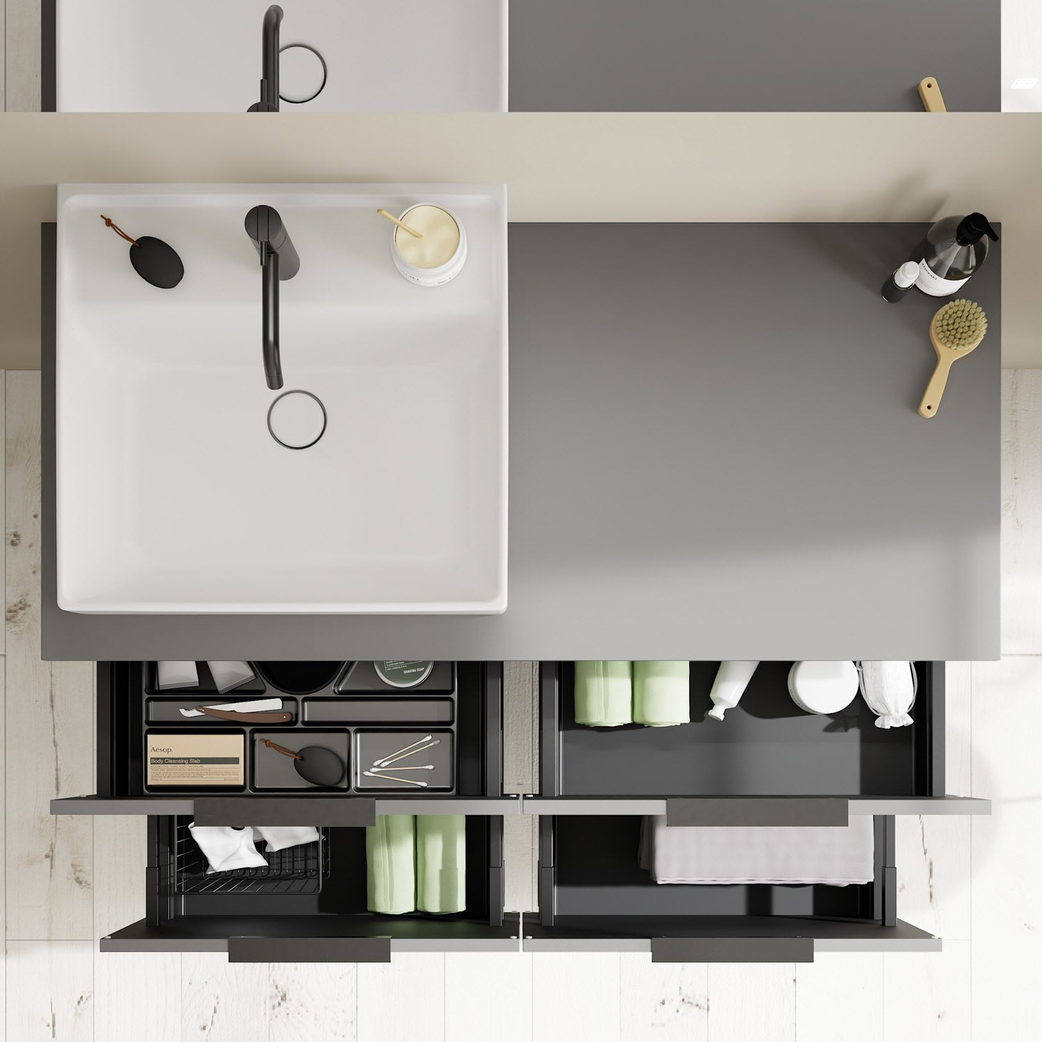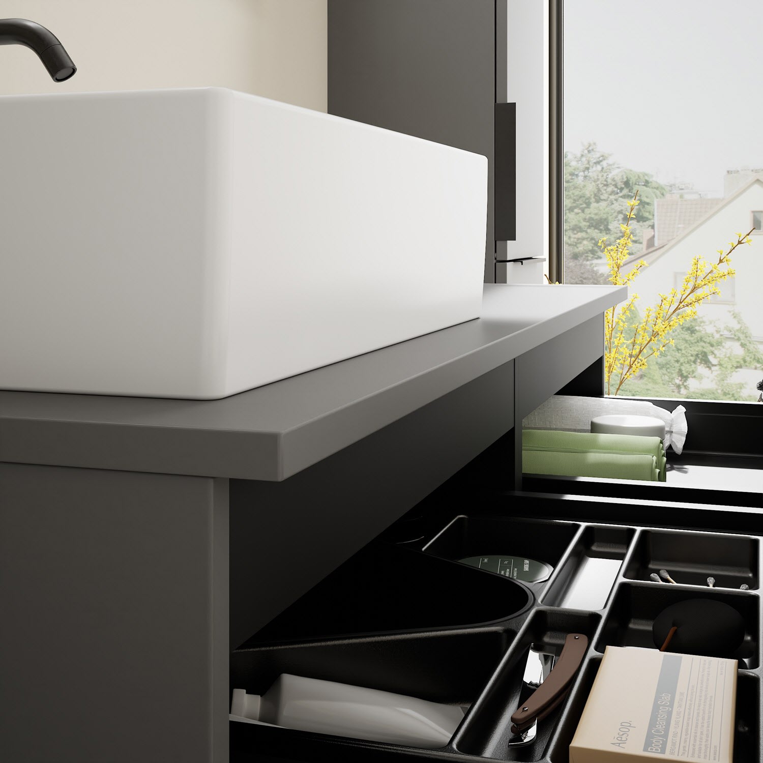 - 2 Schubladen oben, 35 cm tief, mit Siphonausschnitt und Inneneinteilung