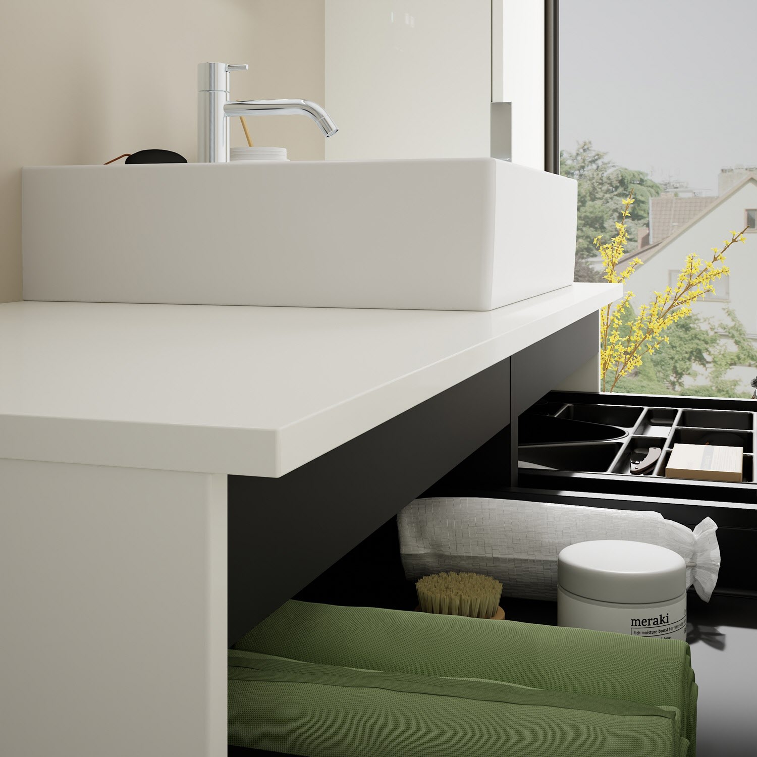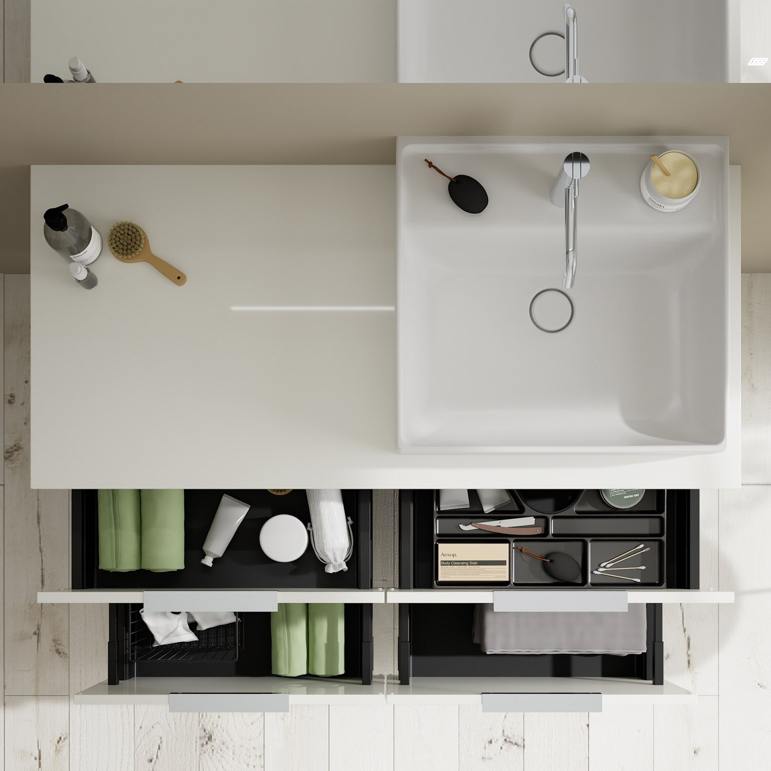 - 2 Schubladen oben, 35 cm tief, mit Siphonausschnitt und Inneneinteilung