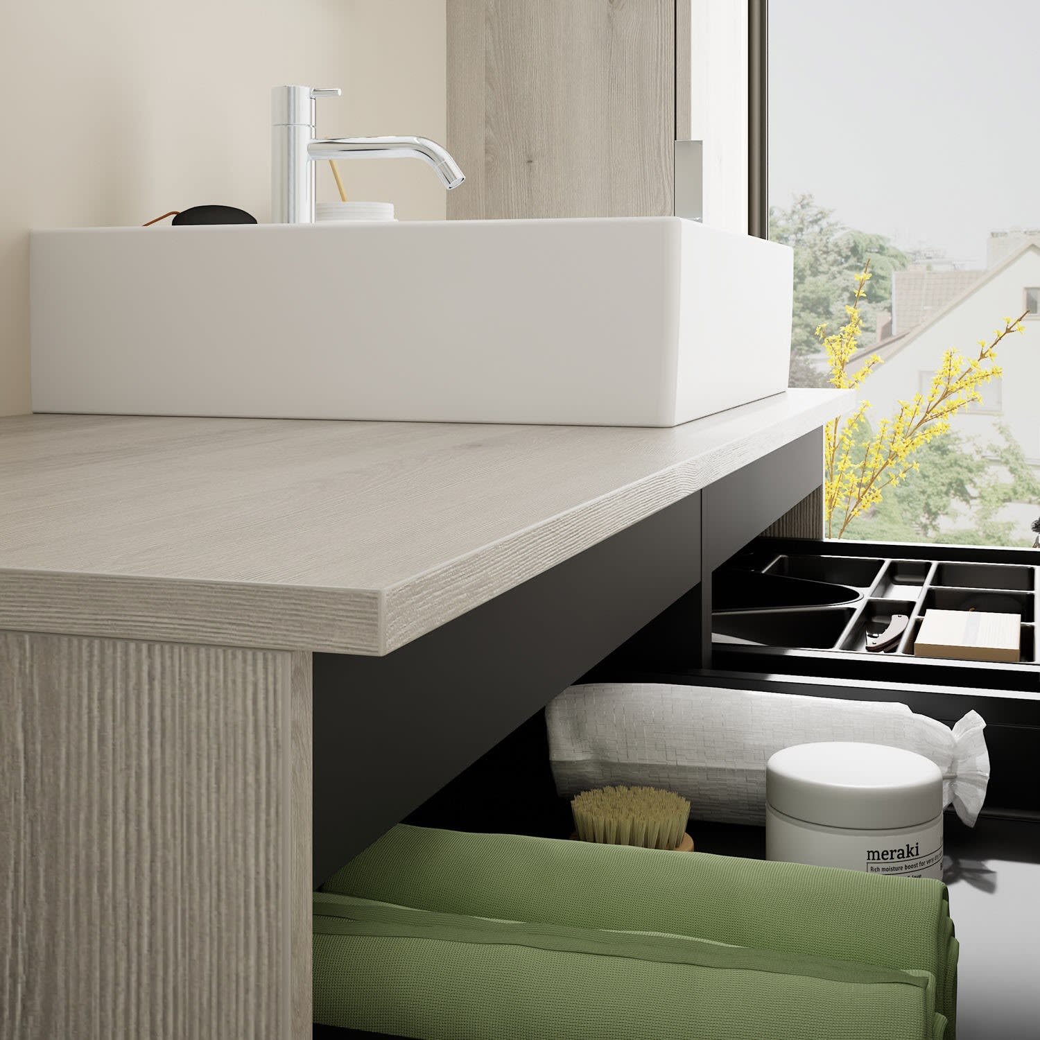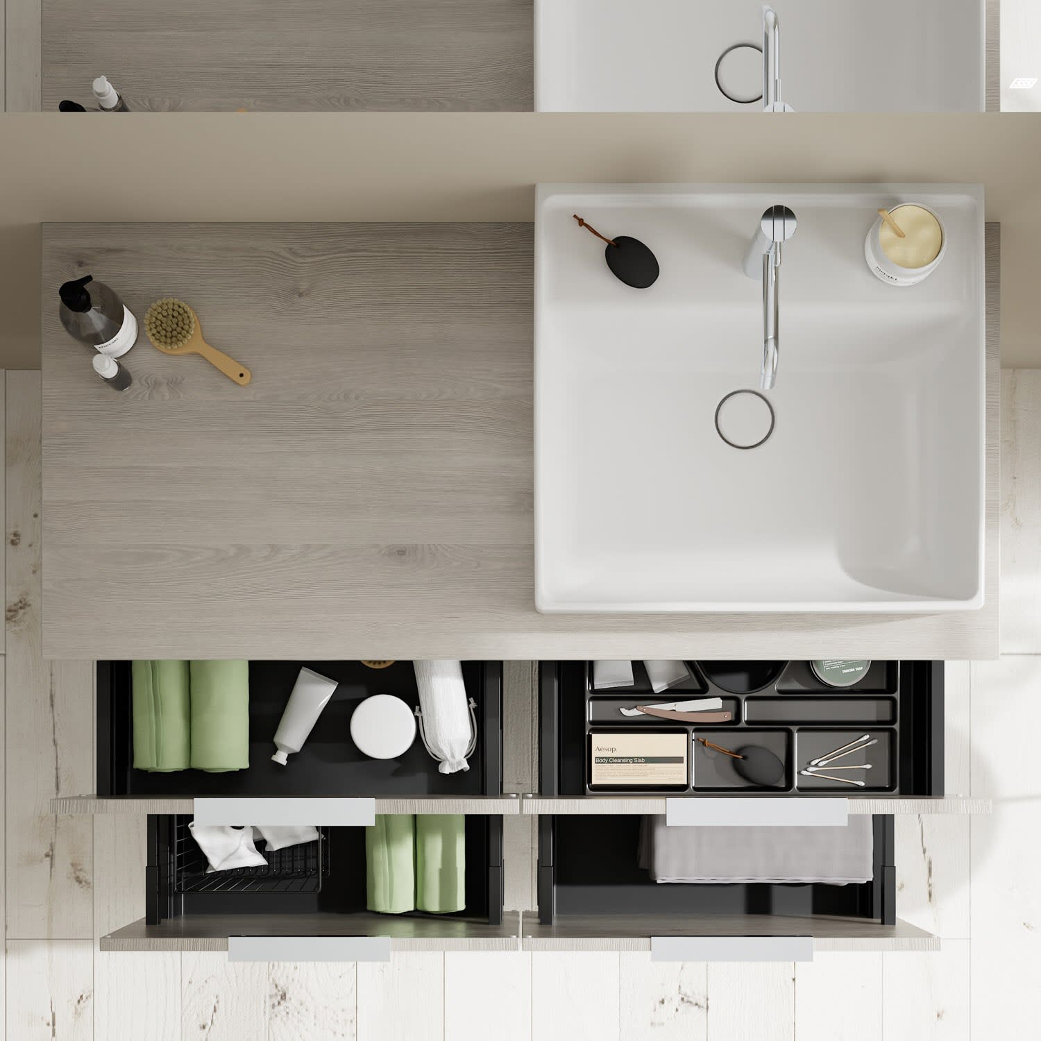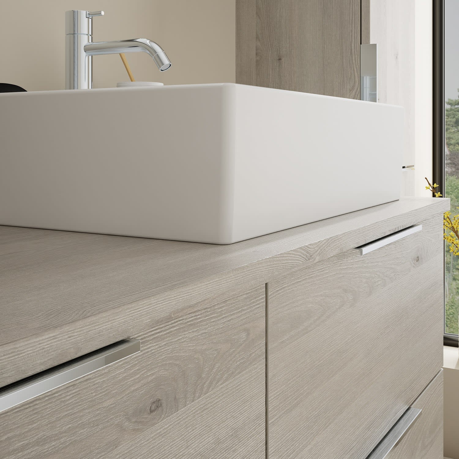 - 2 Schubladen oben, 35 cm tief, mit Siphonausschnitt und Inneneinteilung