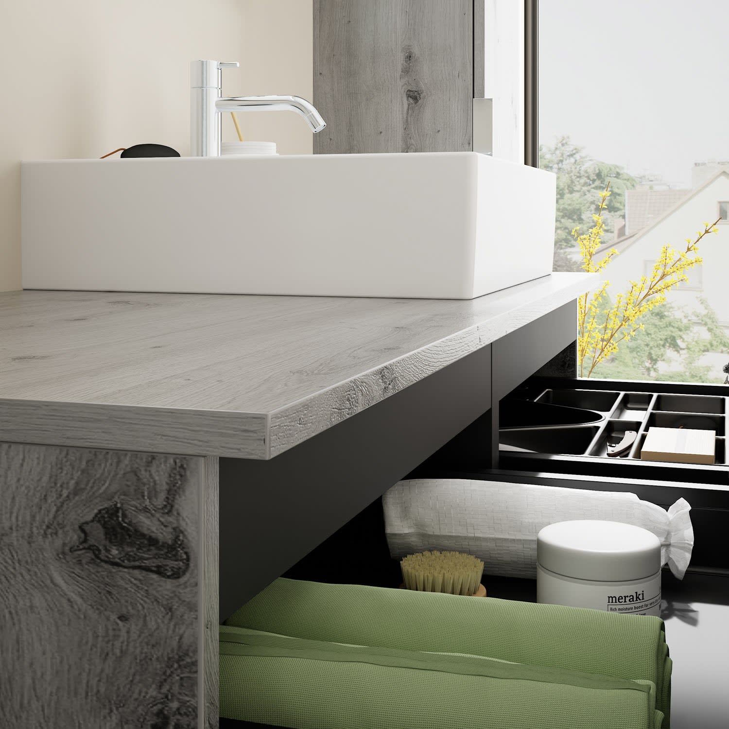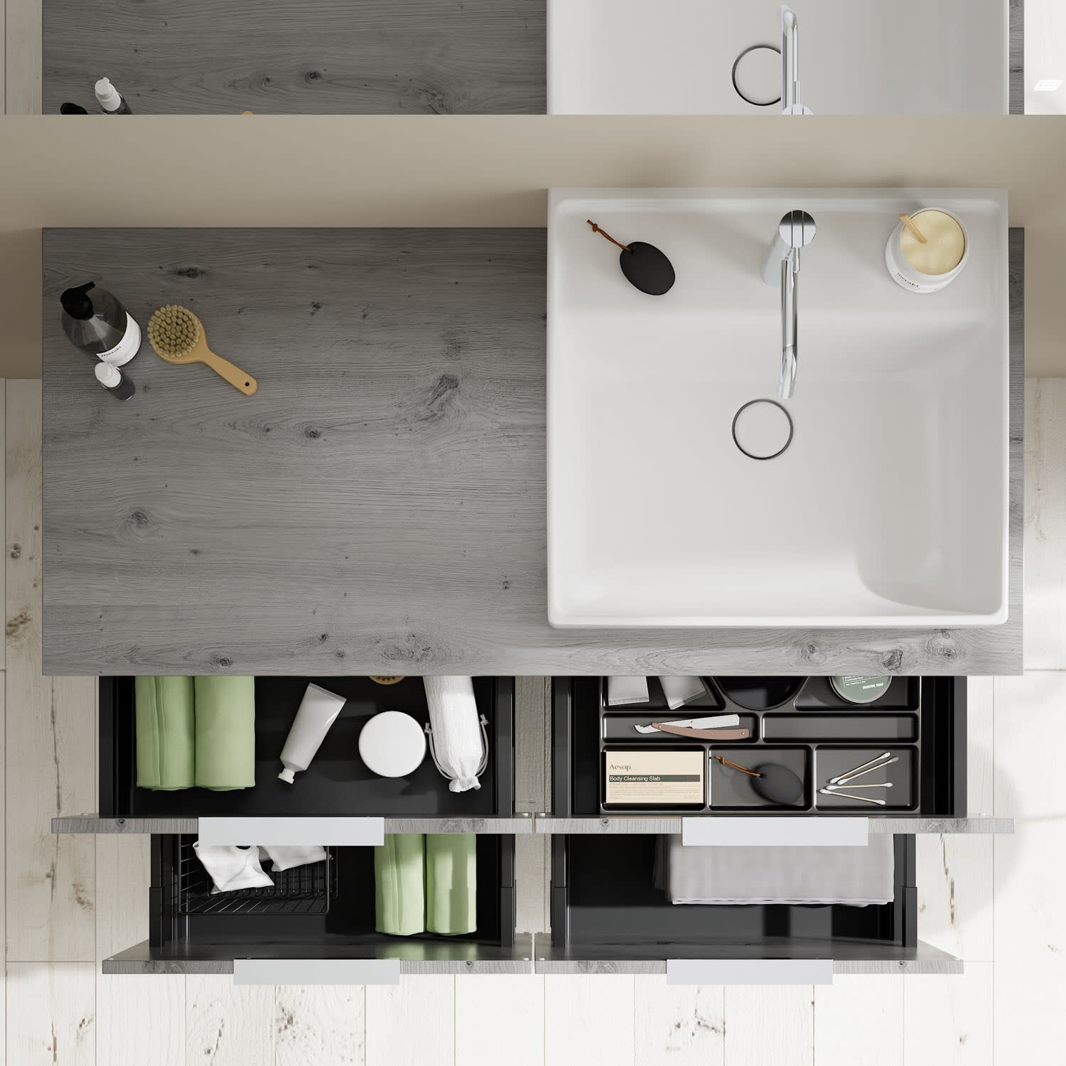- 2 Schubladen oben, 35 cm tief, mit Siphonausschnitt und Inneneinteilung