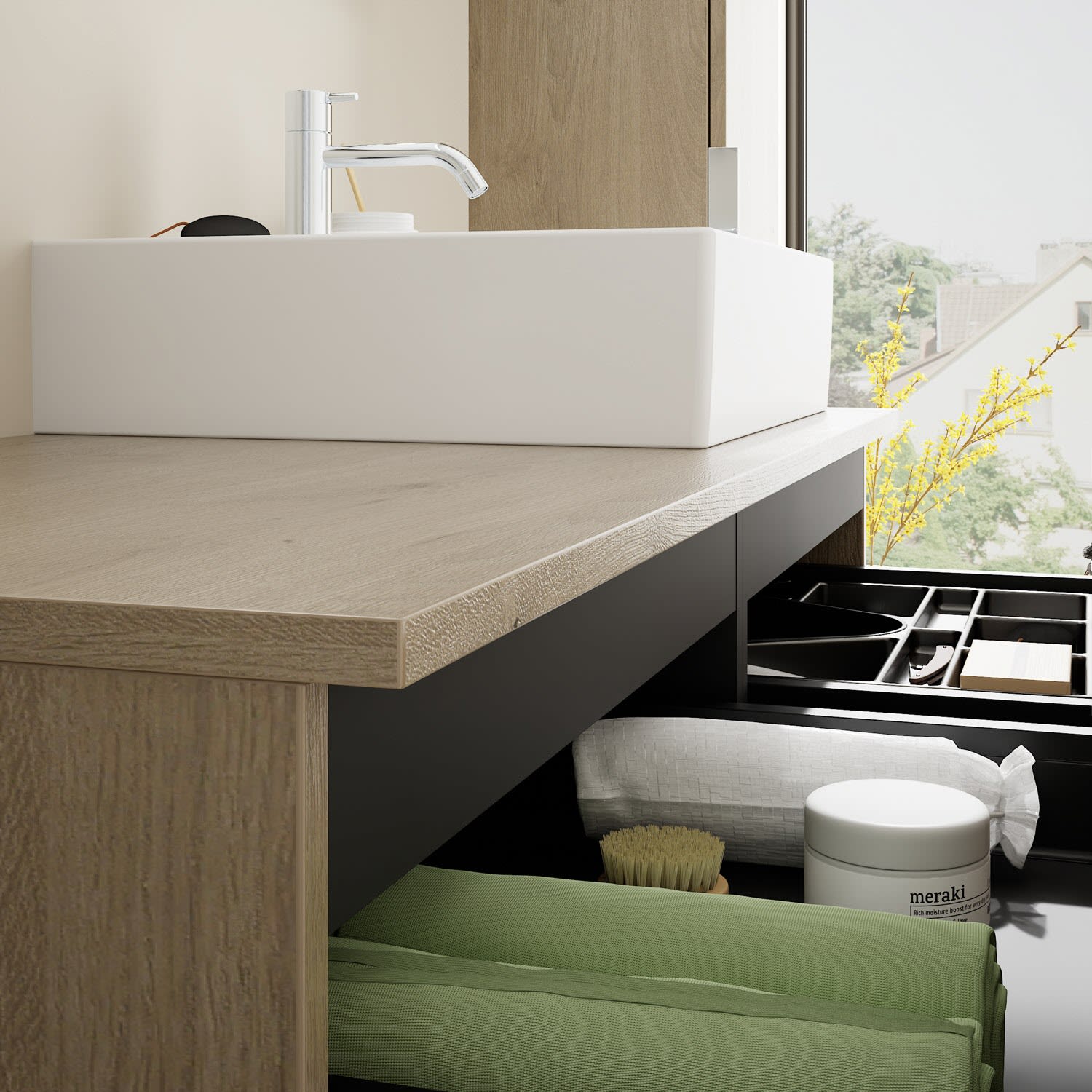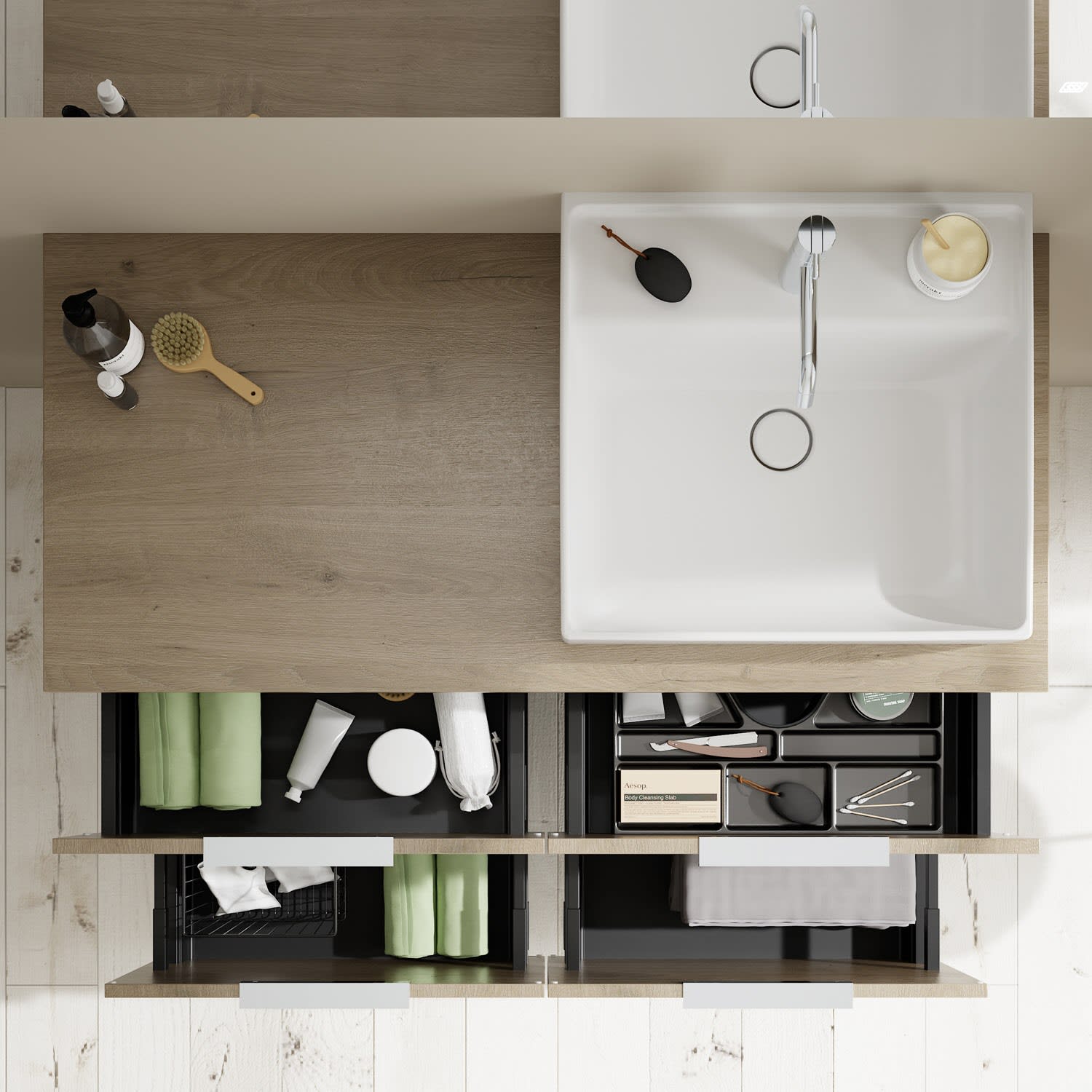 - 2 Schubladen oben, 35 cm tief, mit Siphonausschnitt und Inneneinteilung