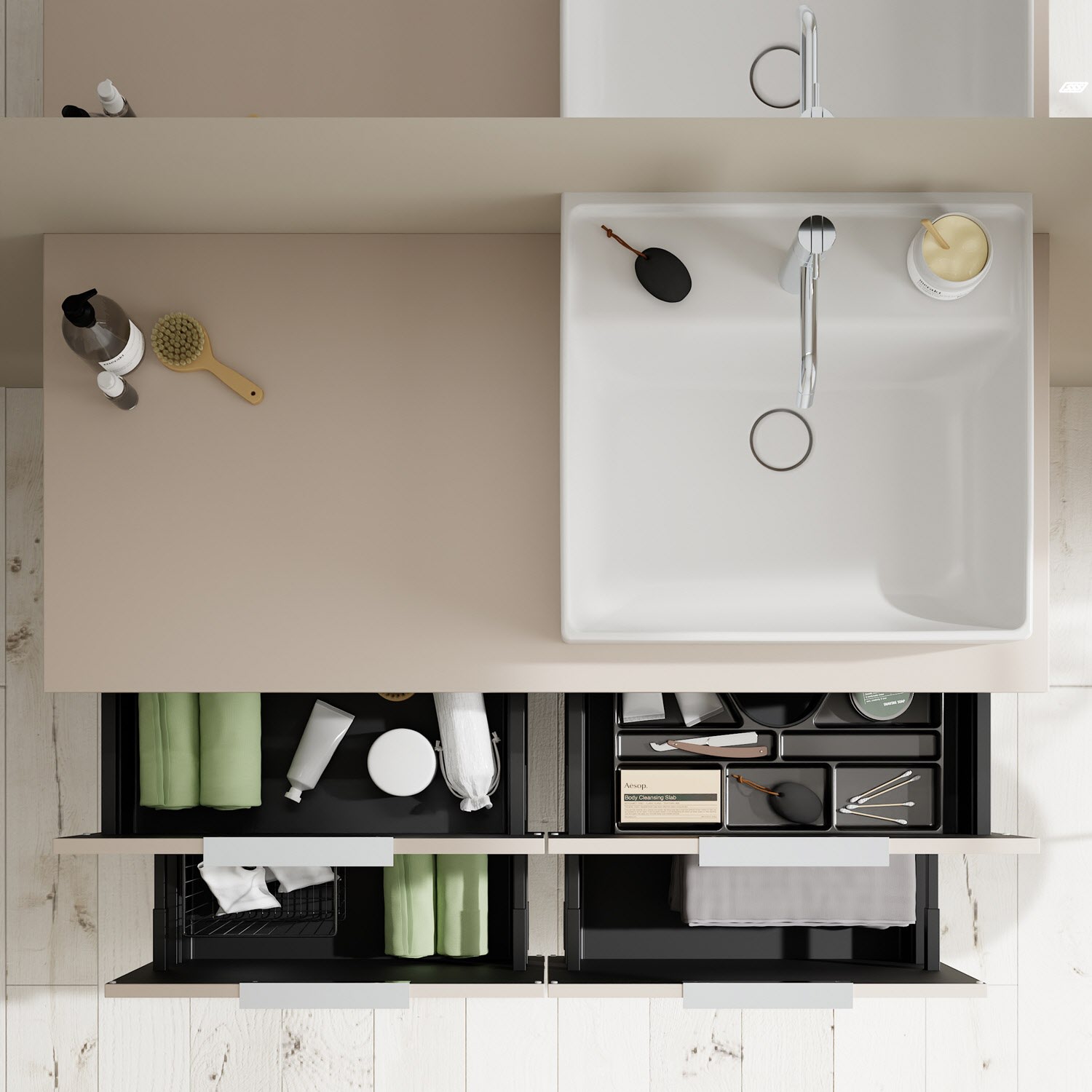- 2 Schubladen oben, 35 cm tief, mit Siphonausschnitt und Inneneinteilung