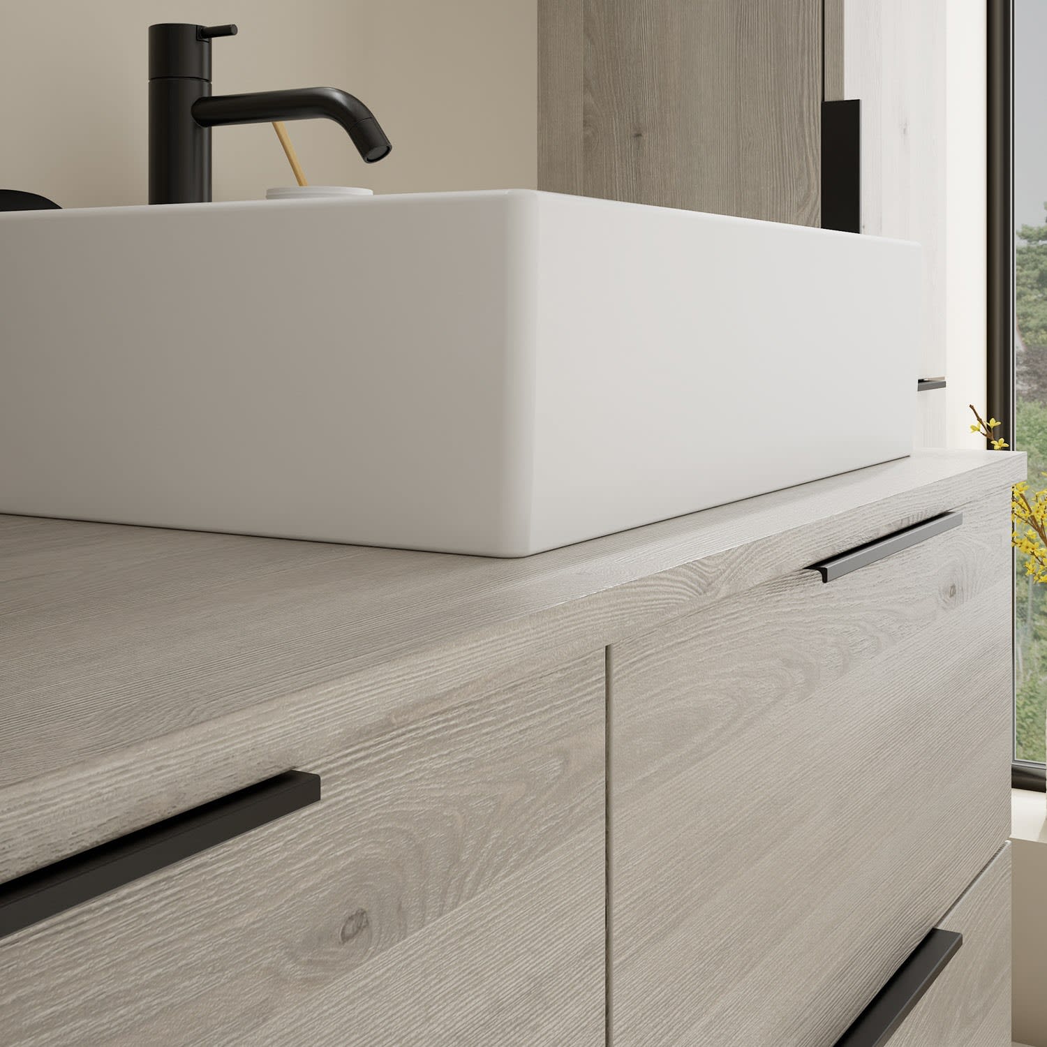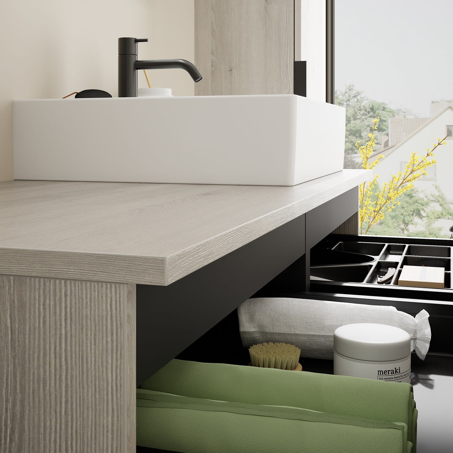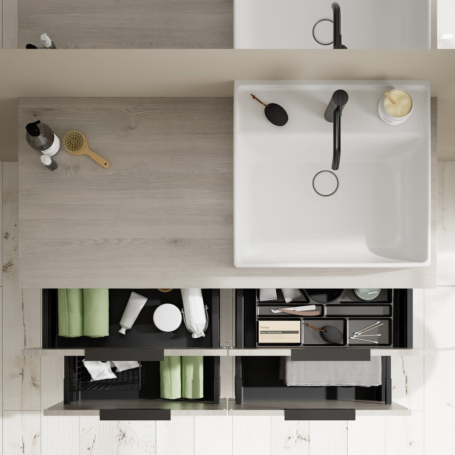 - 2 Schubladen oben, 35 cm tief, mit Siphonausschnitt und Inneneinteilung