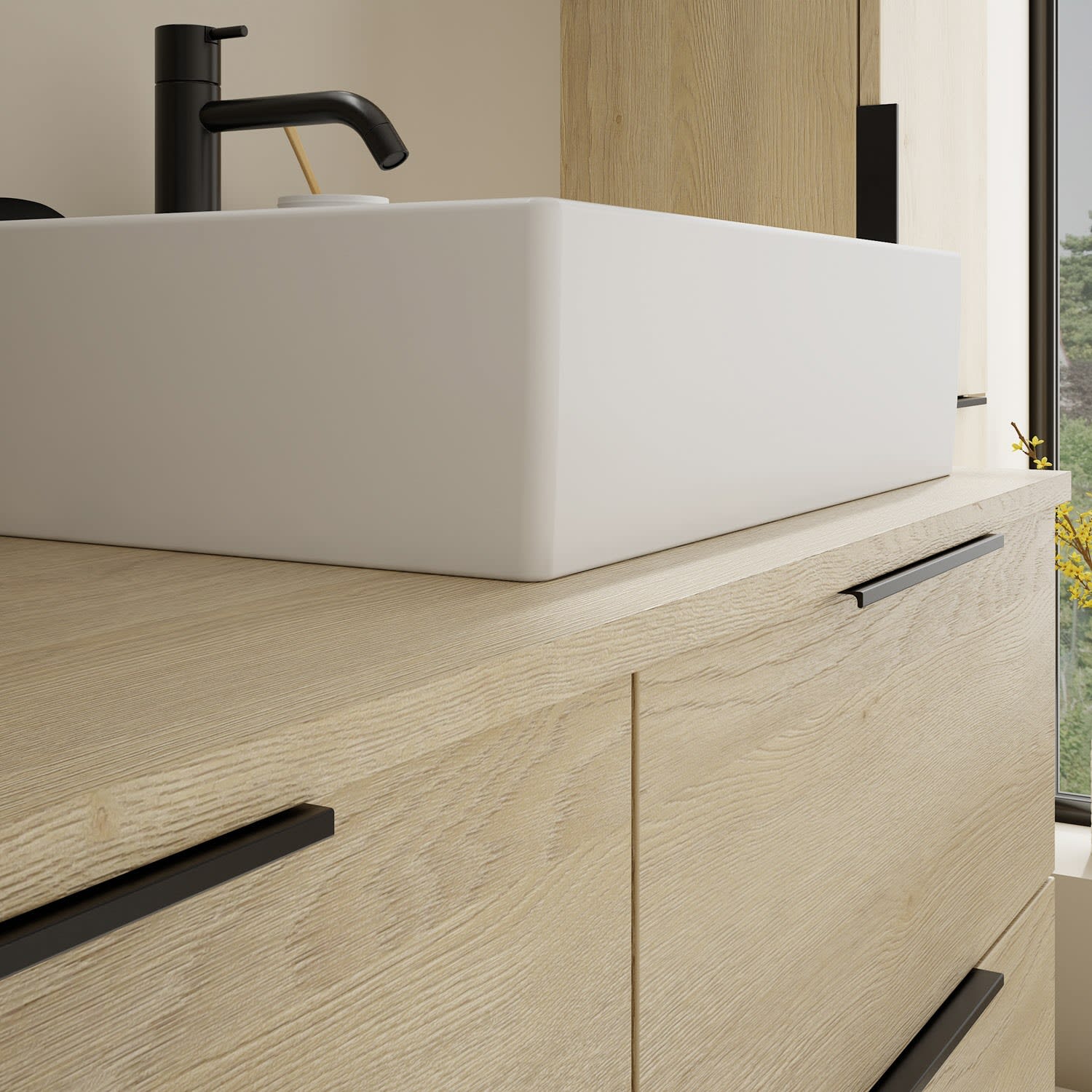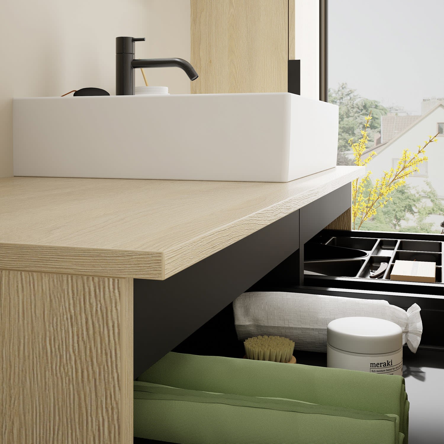 - 2 Schubladen oben, 35 cm tief, mit Siphonausschnitt und Inneneinteilung