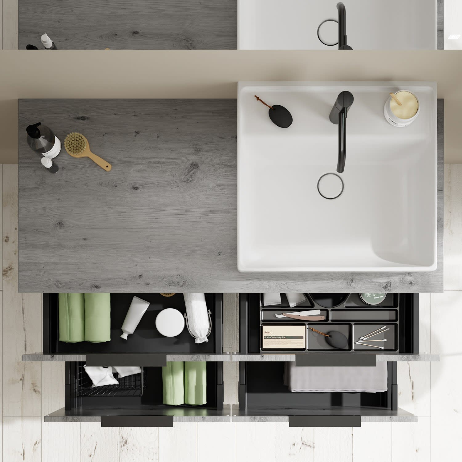 - 2 Schubladen oben, 35 cm tief, mit Siphonausschnitt und Inneneinteilung