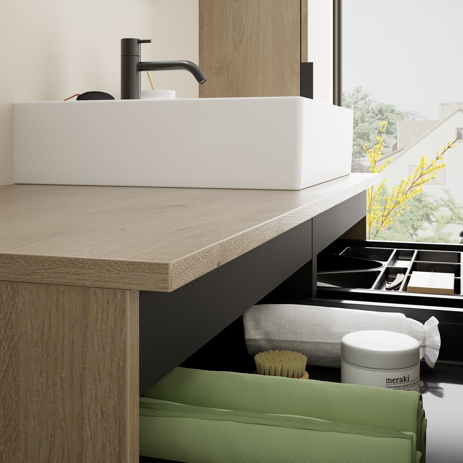 - 2 Schubladen oben, 35 cm tief, mit Siphonausschnitt und Inneneinteilung