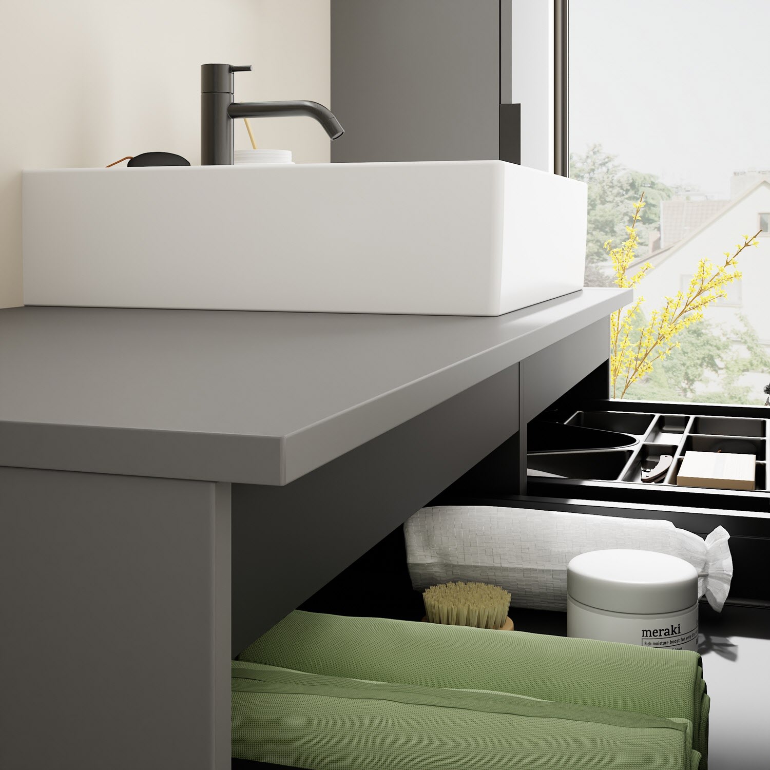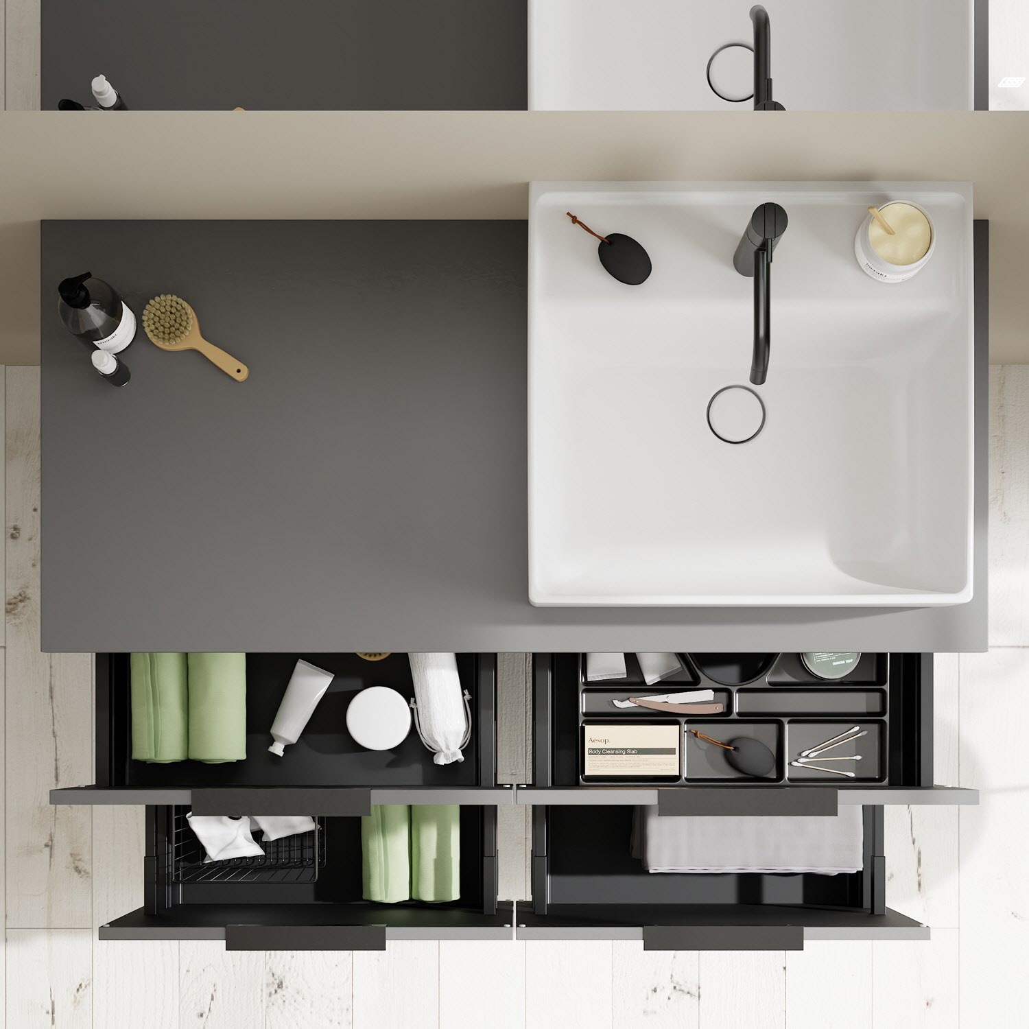 - 2 Schubladen oben, 35 cm tief, mit Siphonausschnitt und Inneneinteilung