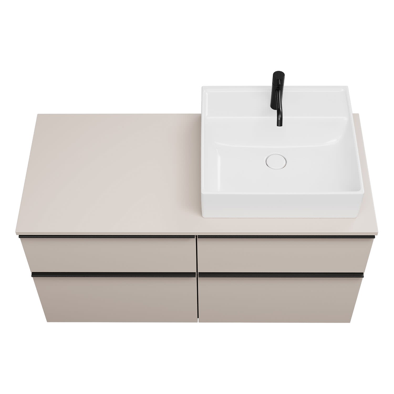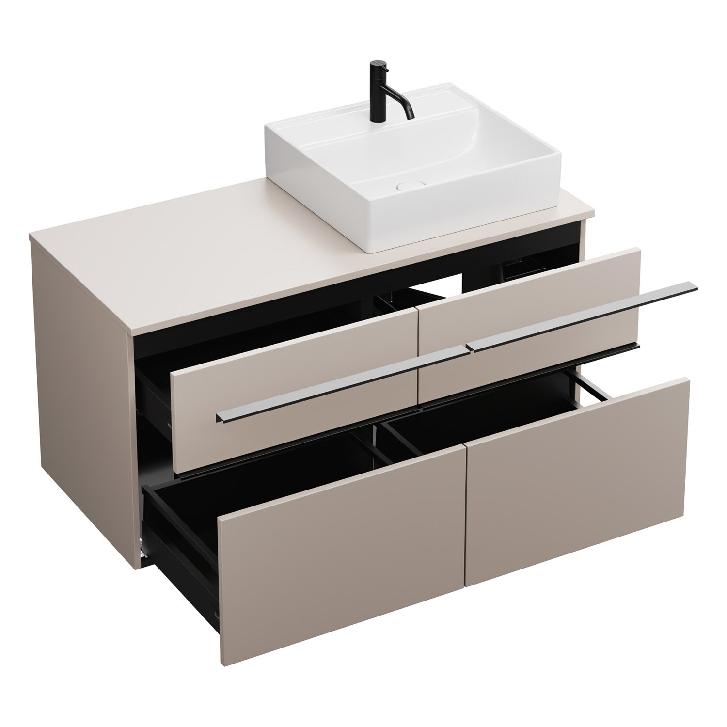 - 2 Schubladen oben, 35 cm tief, mit Siphonausschnitt und Inneneinteilung