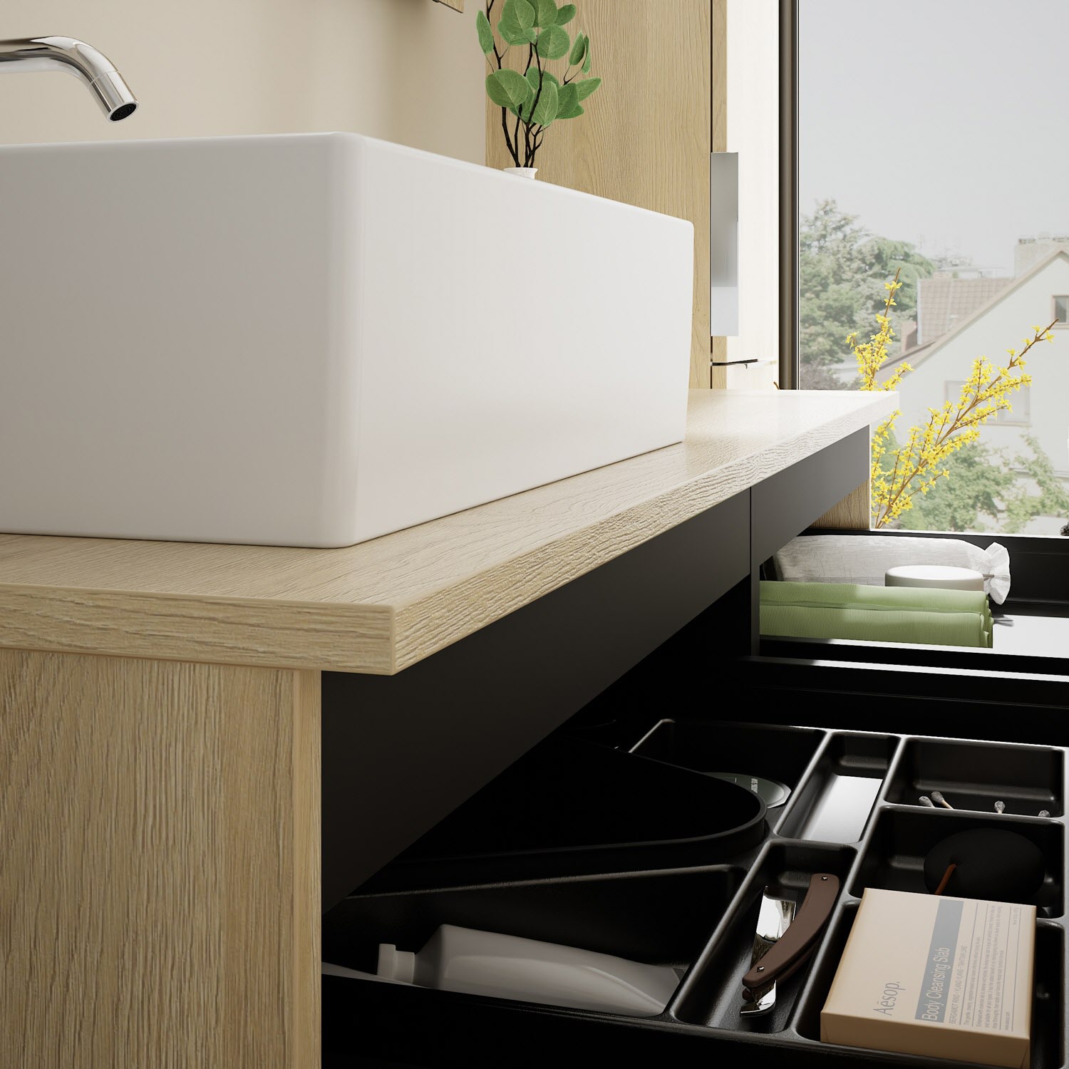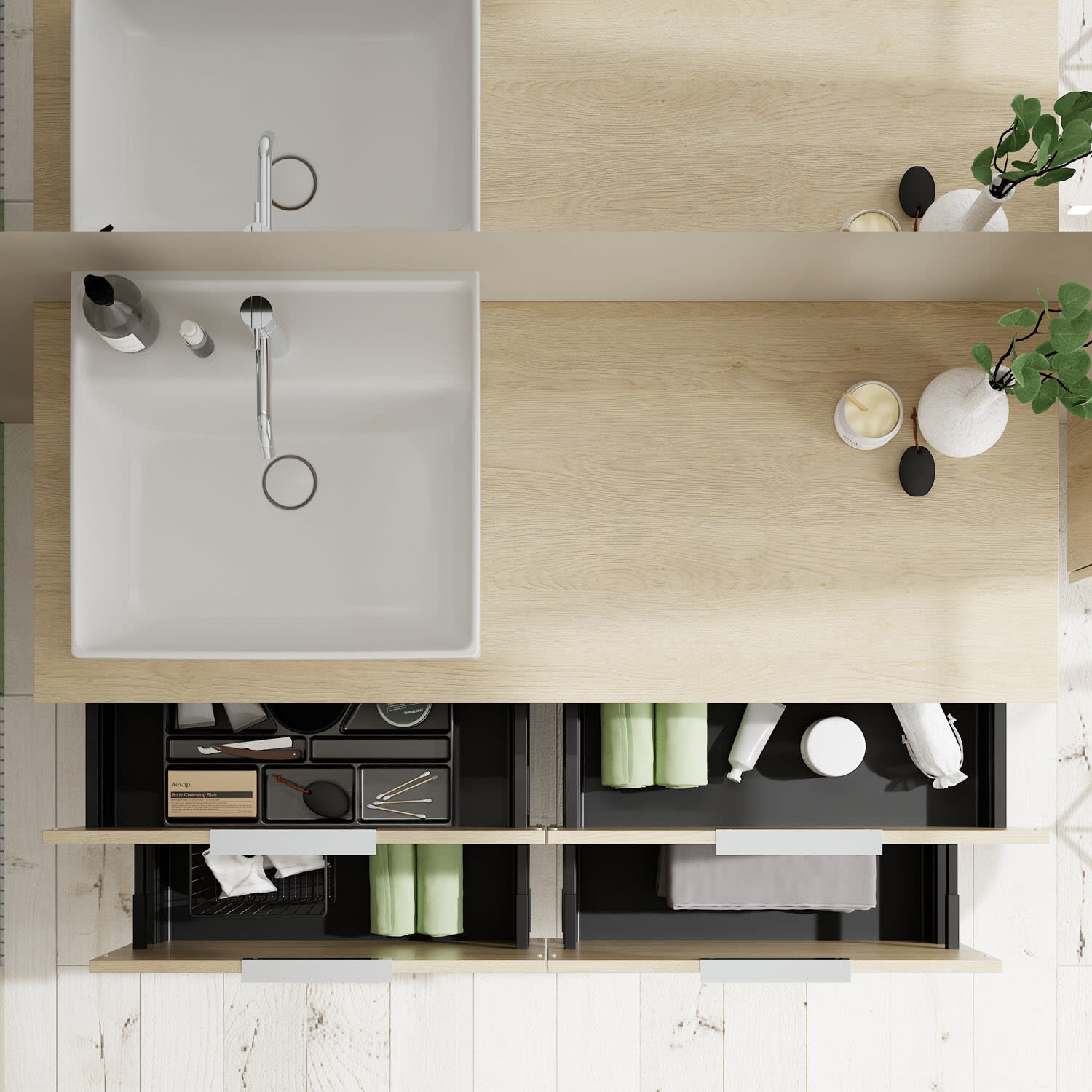 - 2 Schubladen oben, 35 cm tief, mit Siphonausschnitt und Inneneinteilung