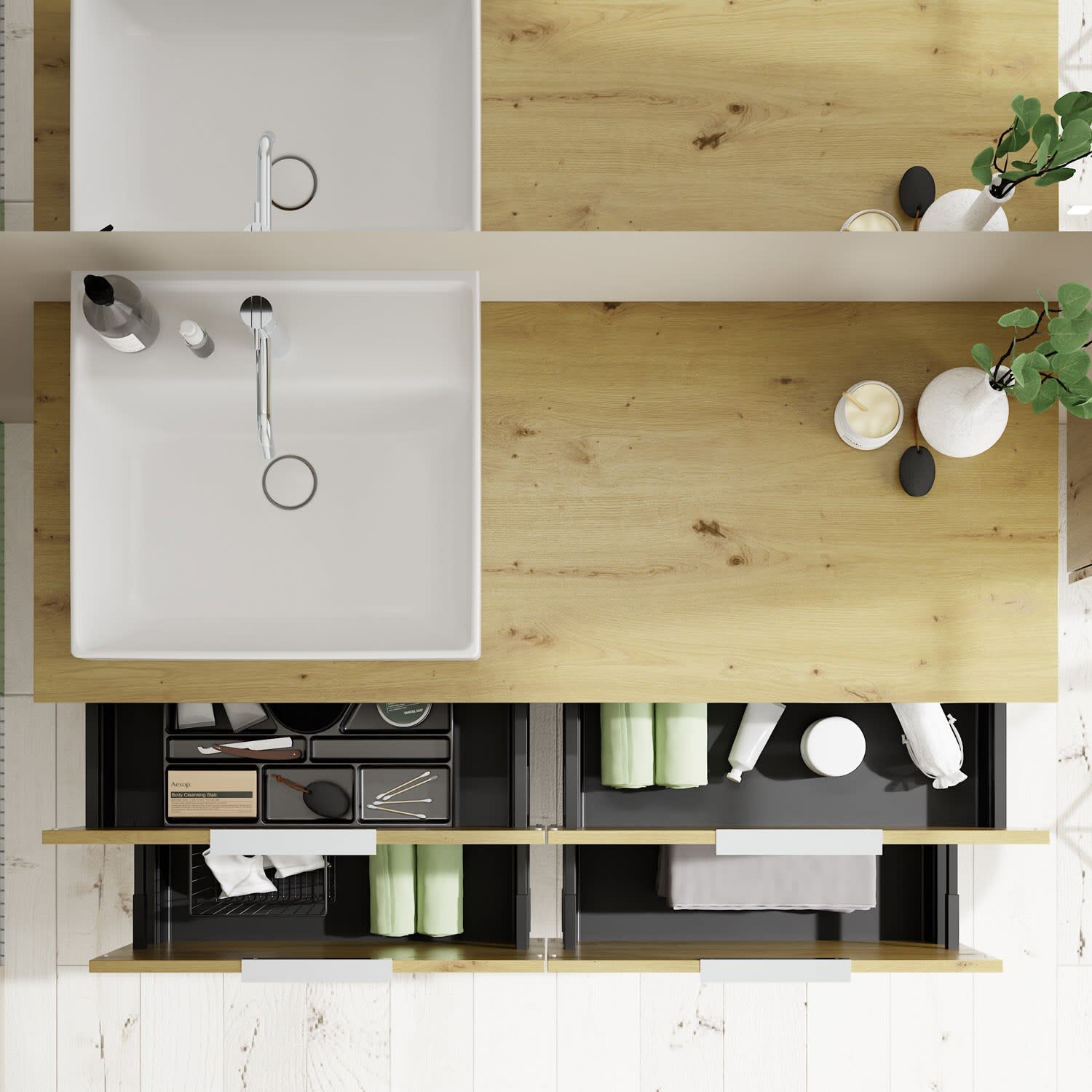 - 2 Schubladen oben, 35 cm tief, mit Siphonausschnitt und Inneneinteilung