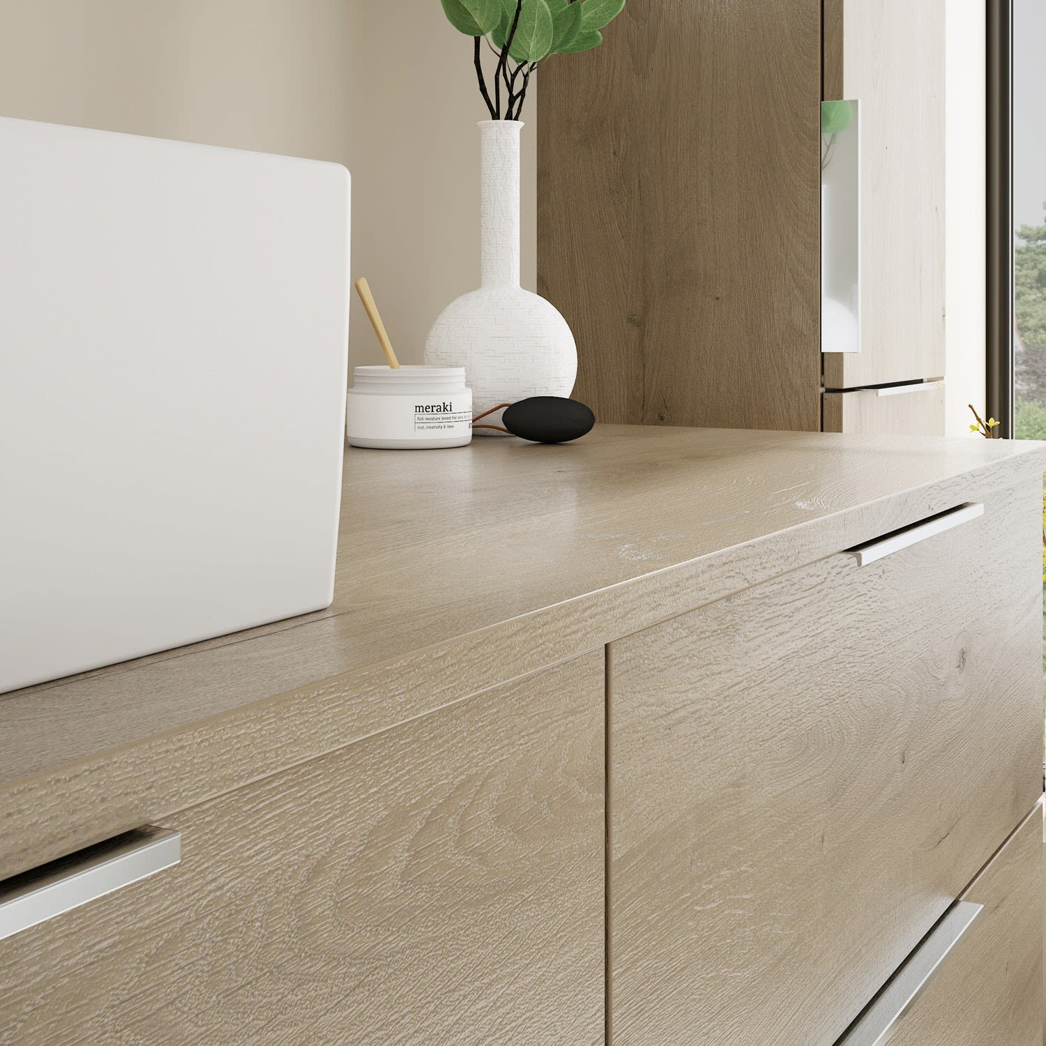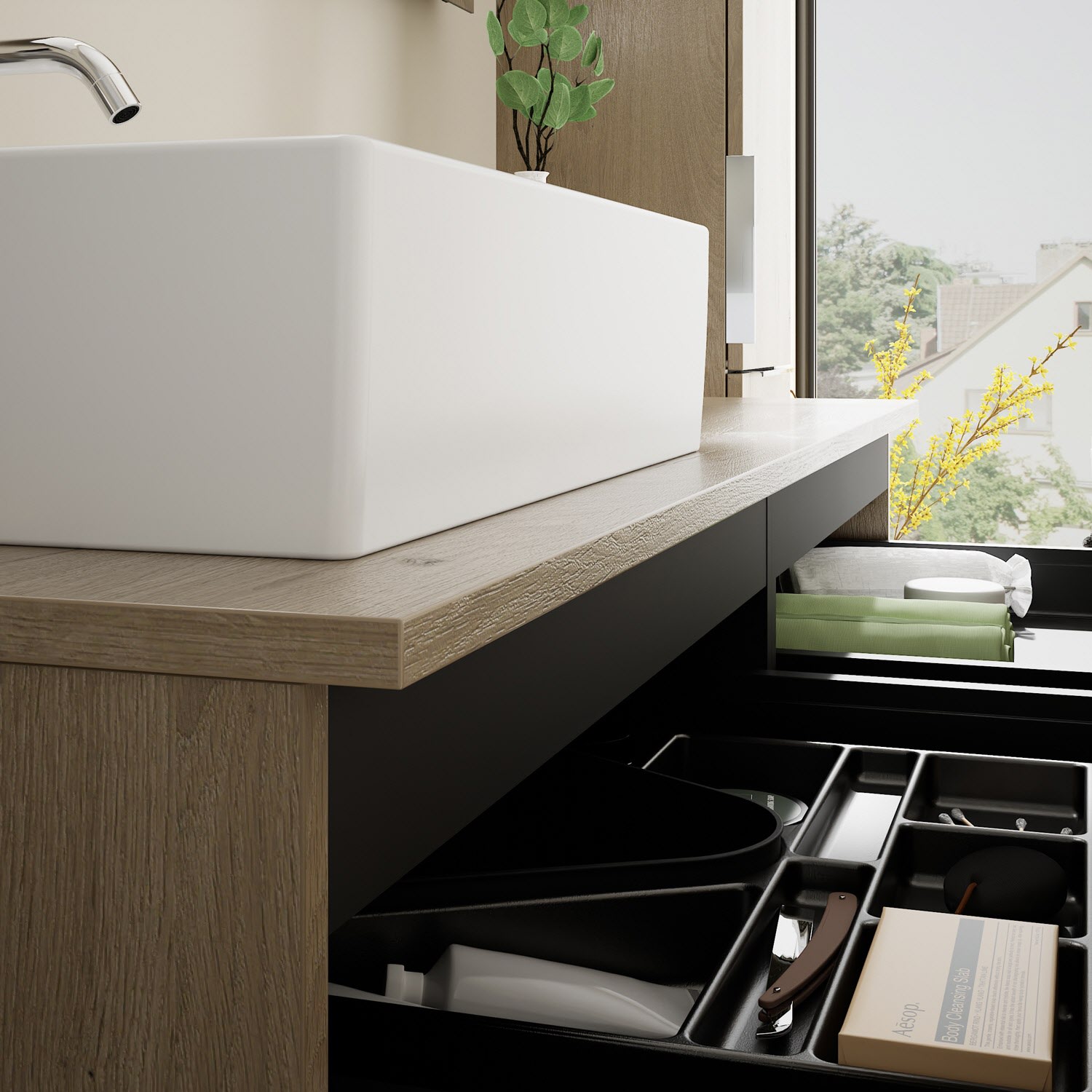 - 2 Schubladen oben, 35 cm tief, mit Siphonausschnitt und Inneneinteilung