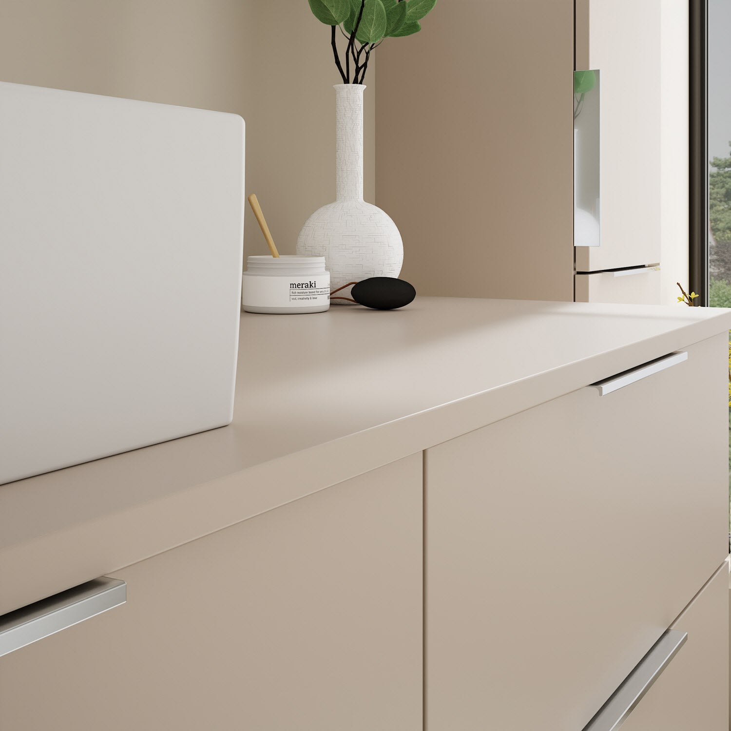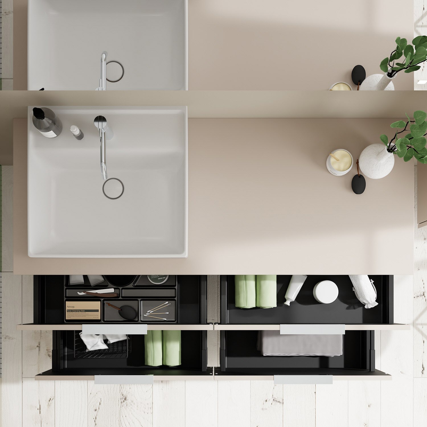 - 2 Schubladen oben, 35 cm tief, mit Siphonausschnitt und Inneneinteilung