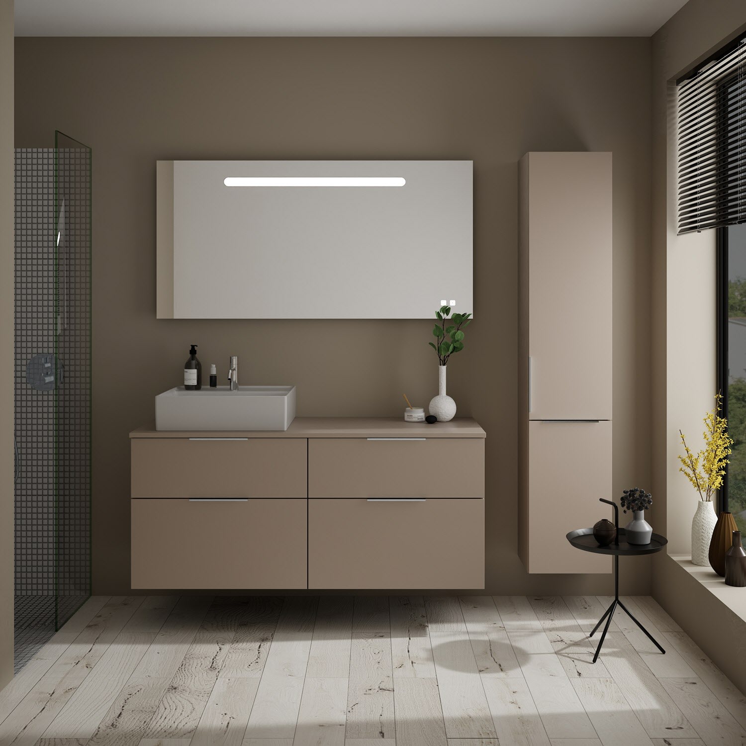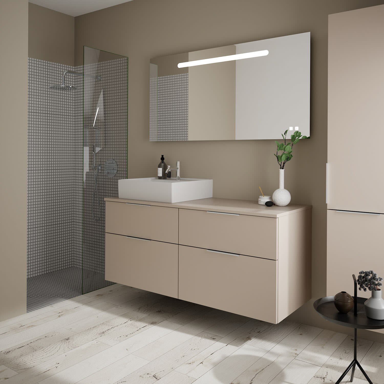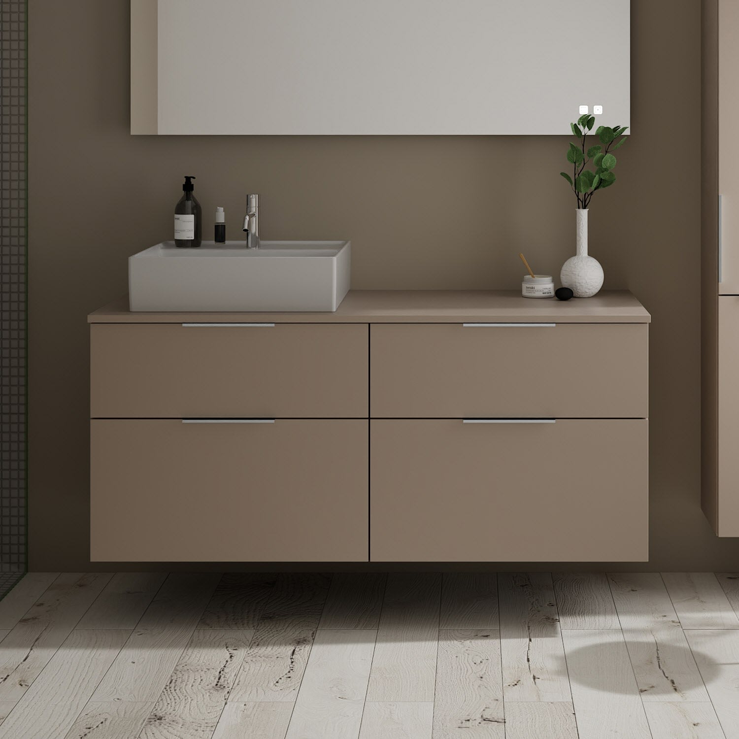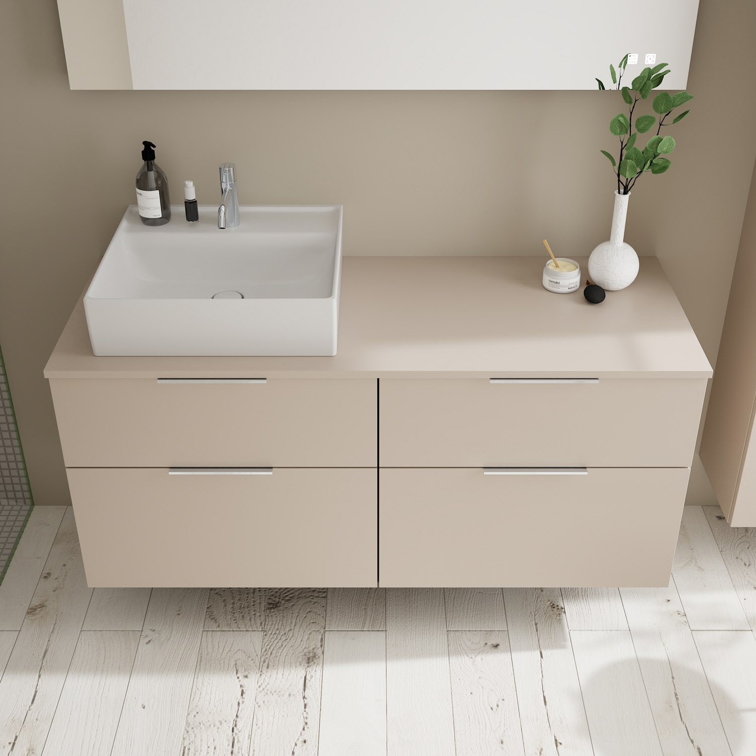 burgbad Eqio Waschtischkombination mit Keramik-Aufsatzwaschtisch 140 cm, links, mit Griff G0146