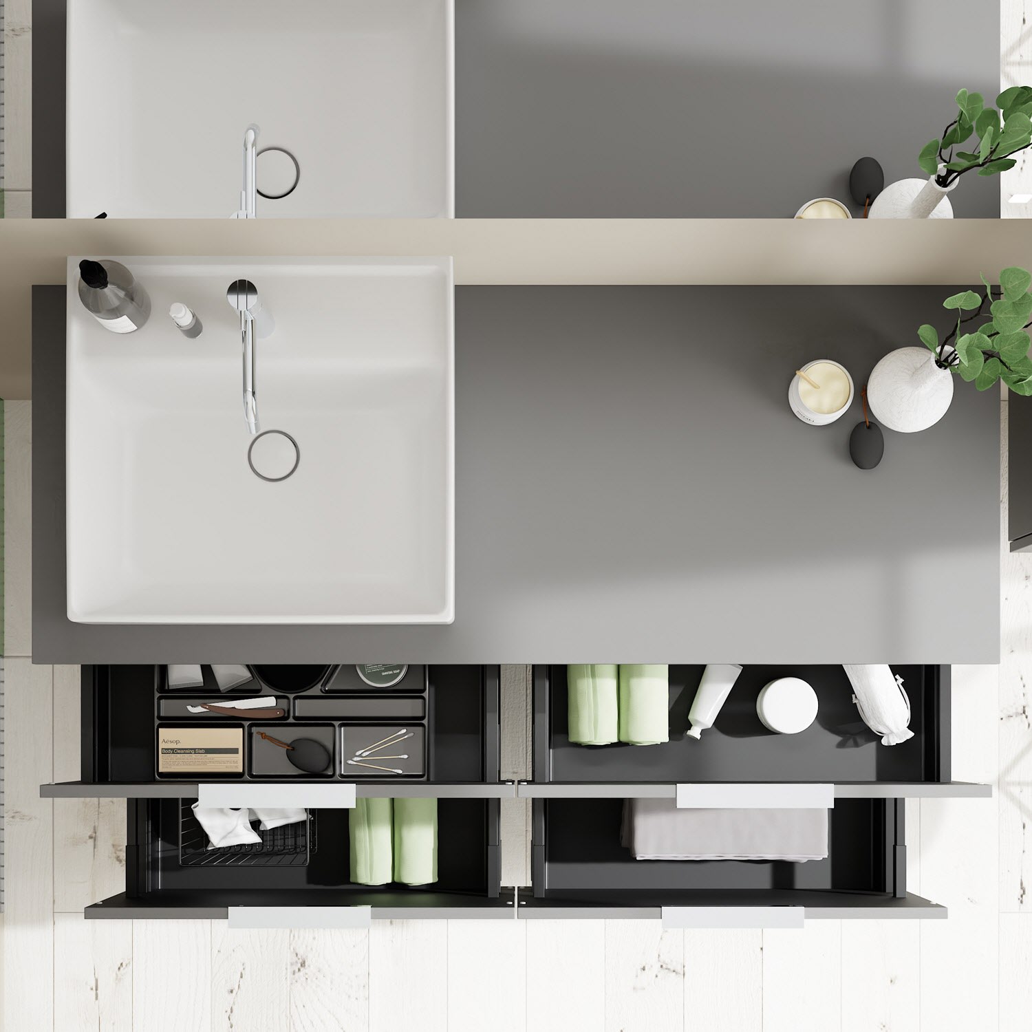 - 2 Schubladen oben, 35 cm tief, mit Siphonausschnitt und Inneneinteilung