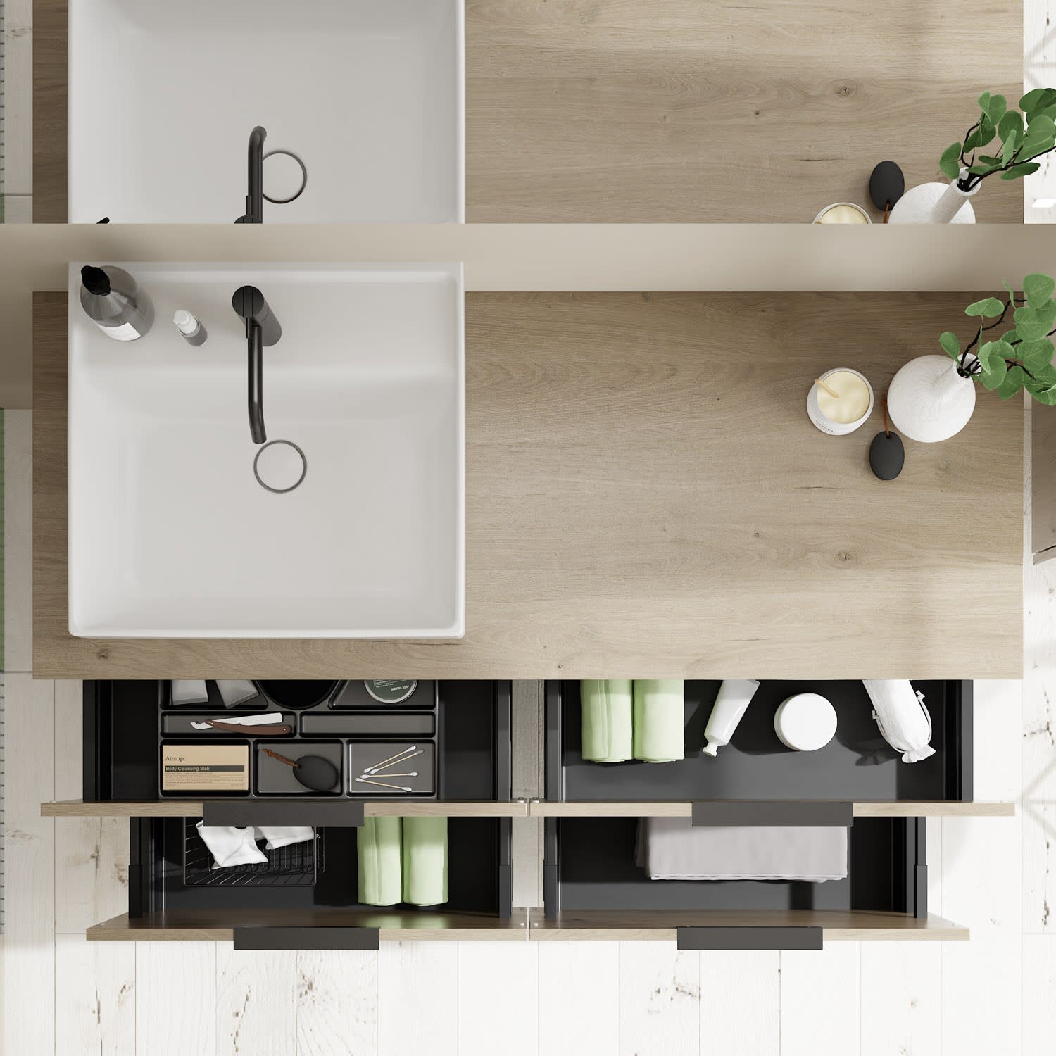 - 2 Schubladen oben, 35 cm tief, mit Siphonausschnitt und Inneneinteilung