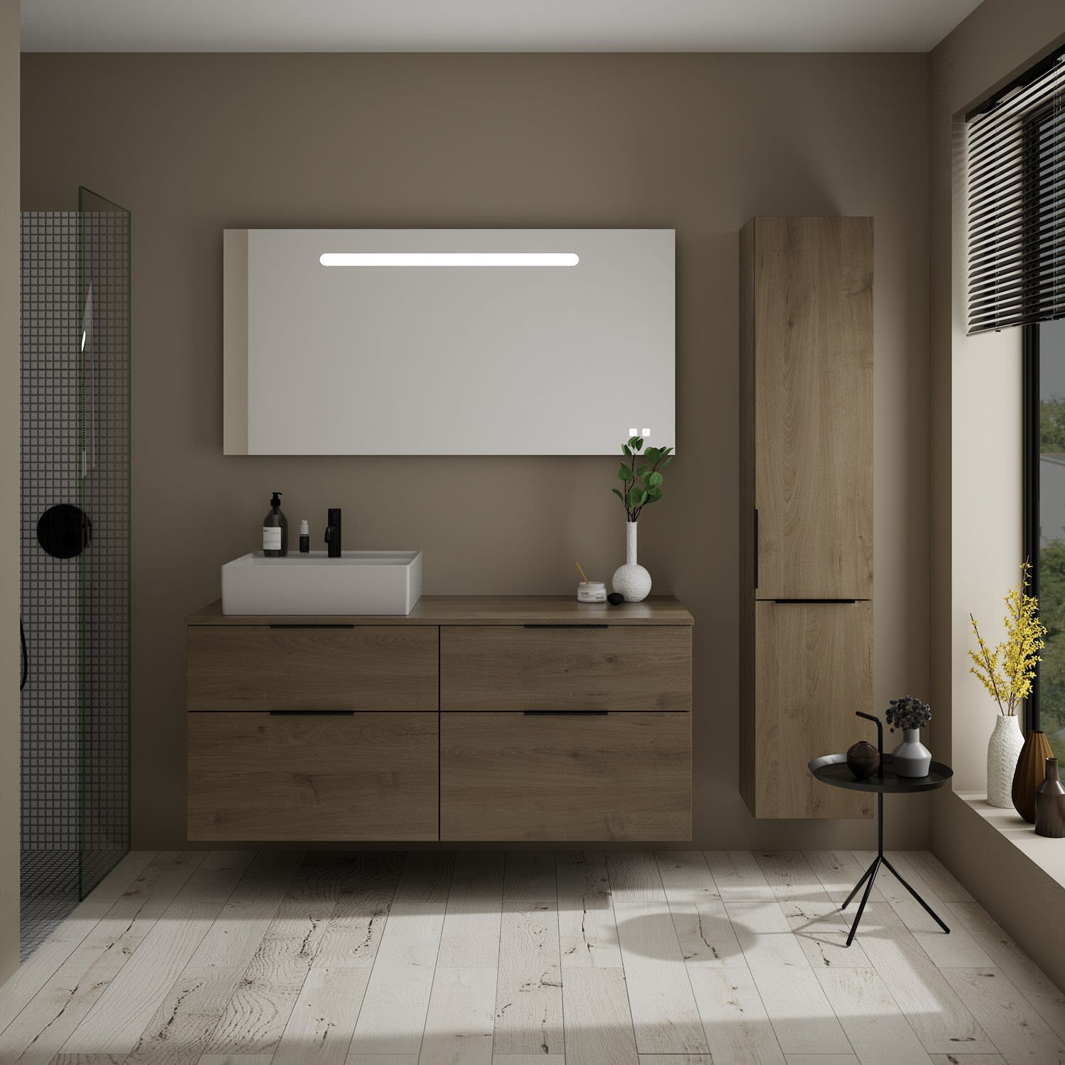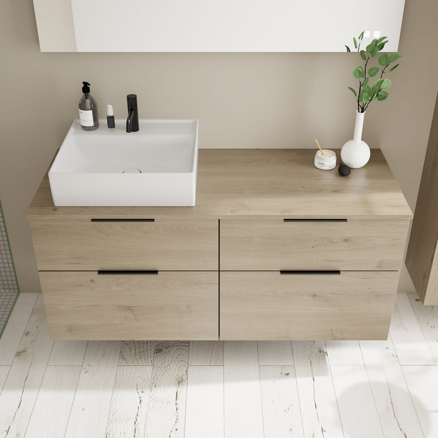 burgbad Eqio Waschtischkombination mit Keramik-Aufsatzwaschtisch 140 cm, links, mit Griff G0200
