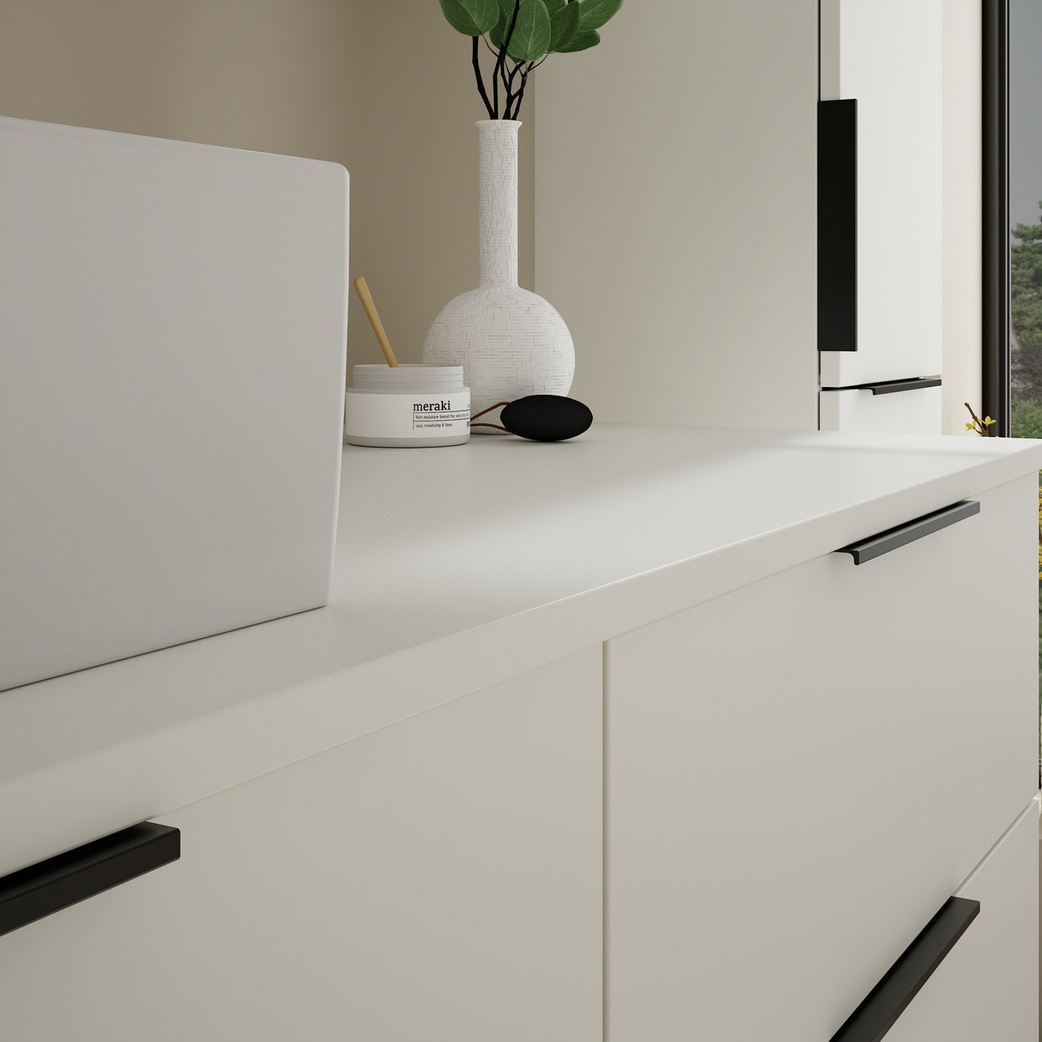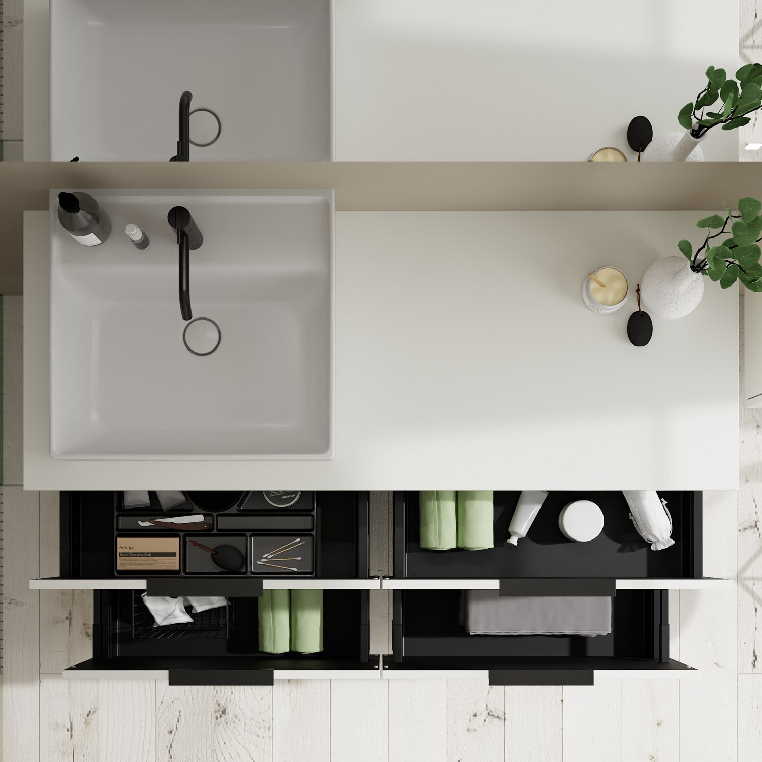 - 2 Schubladen oben, 35 cm tief, mit Siphonausschnitt und Inneneinteilung