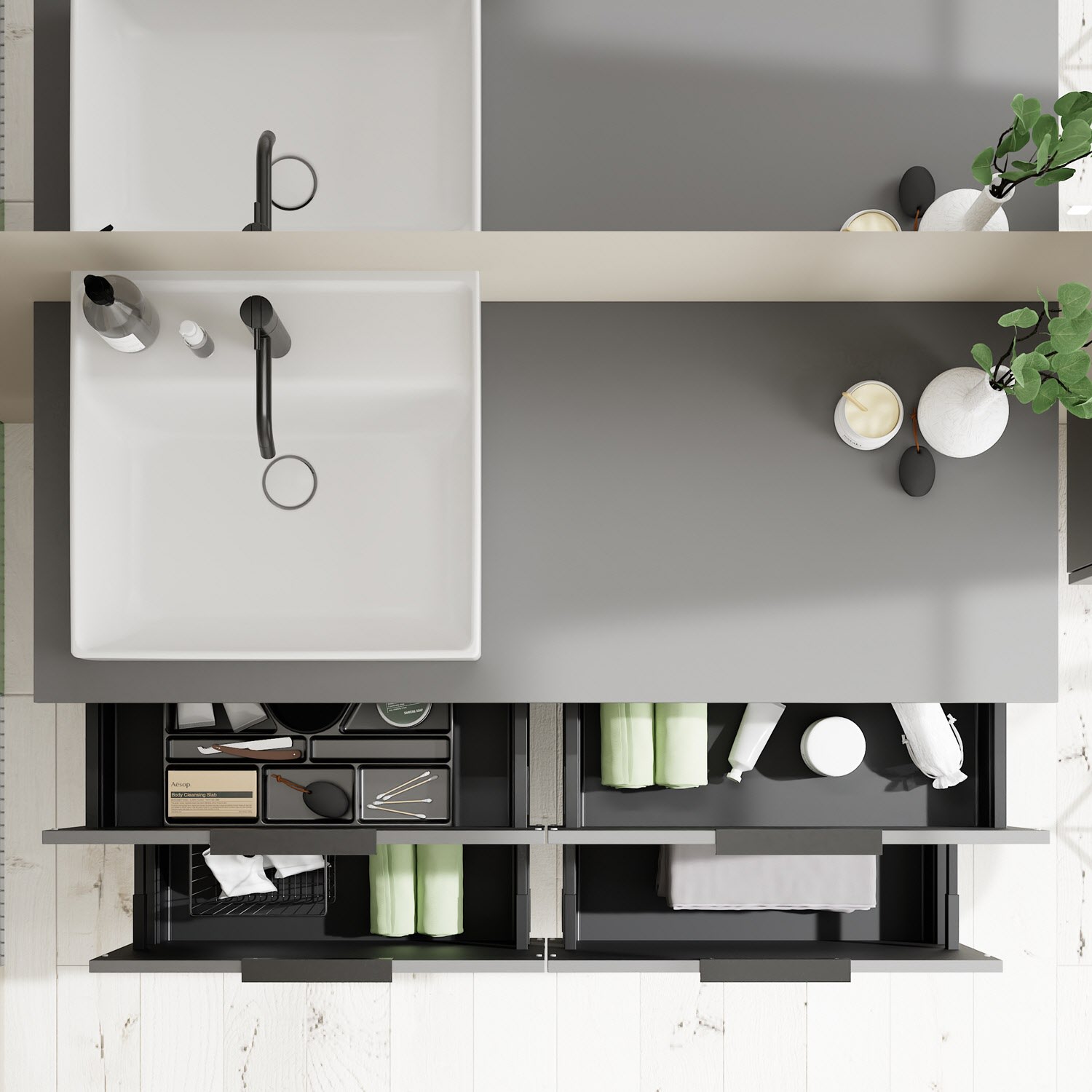 - 2 Schubladen oben, 35 cm tief, mit Siphonausschnitt und Inneneinteilung