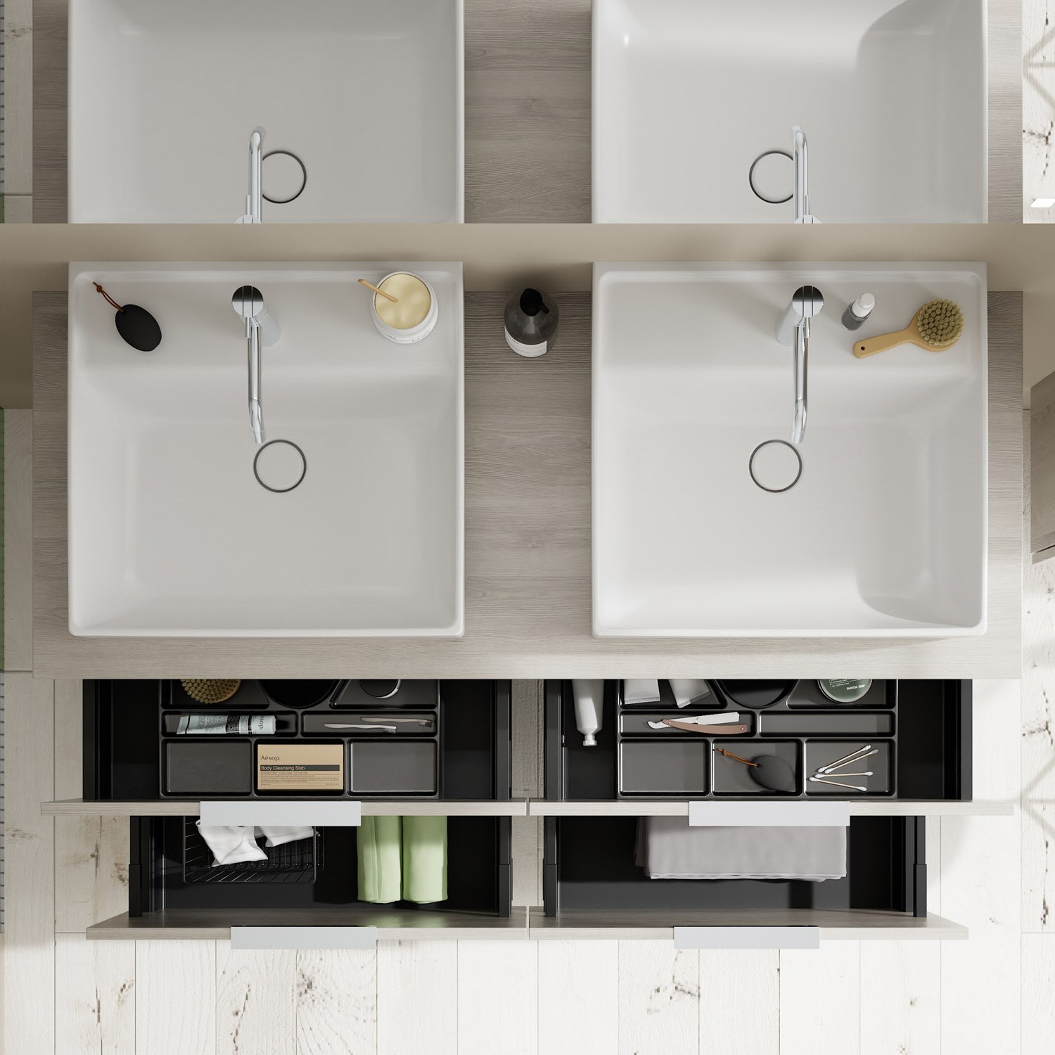 - 2 Schubladen oben, 35 cm tief, mit Siphonausschnitt und Inneneinteilung