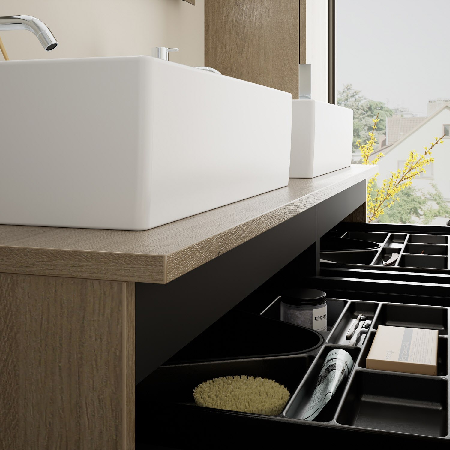 - 2 Schubladen oben, 35 cm tief, mit Siphonausschnitt und Inneneinteilung