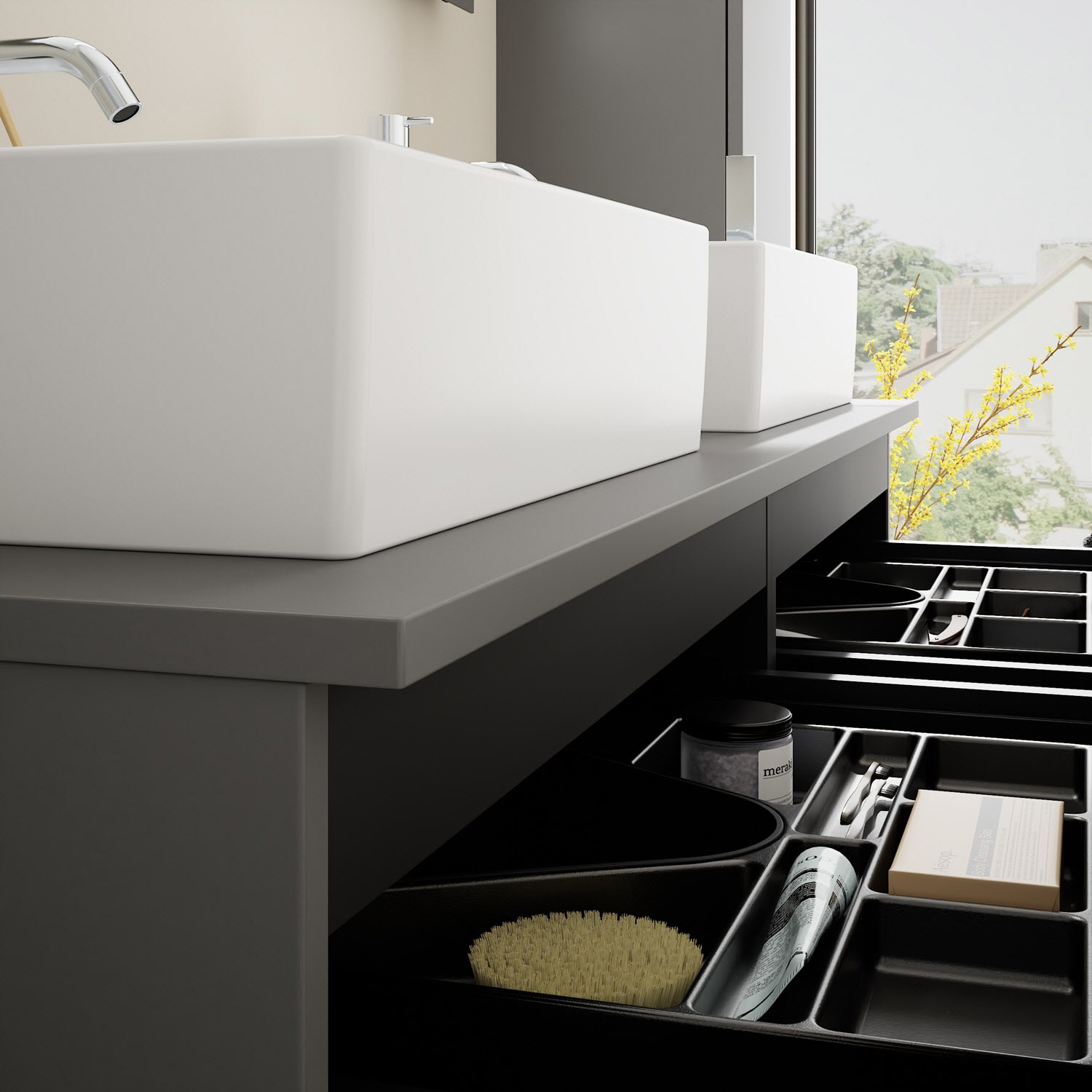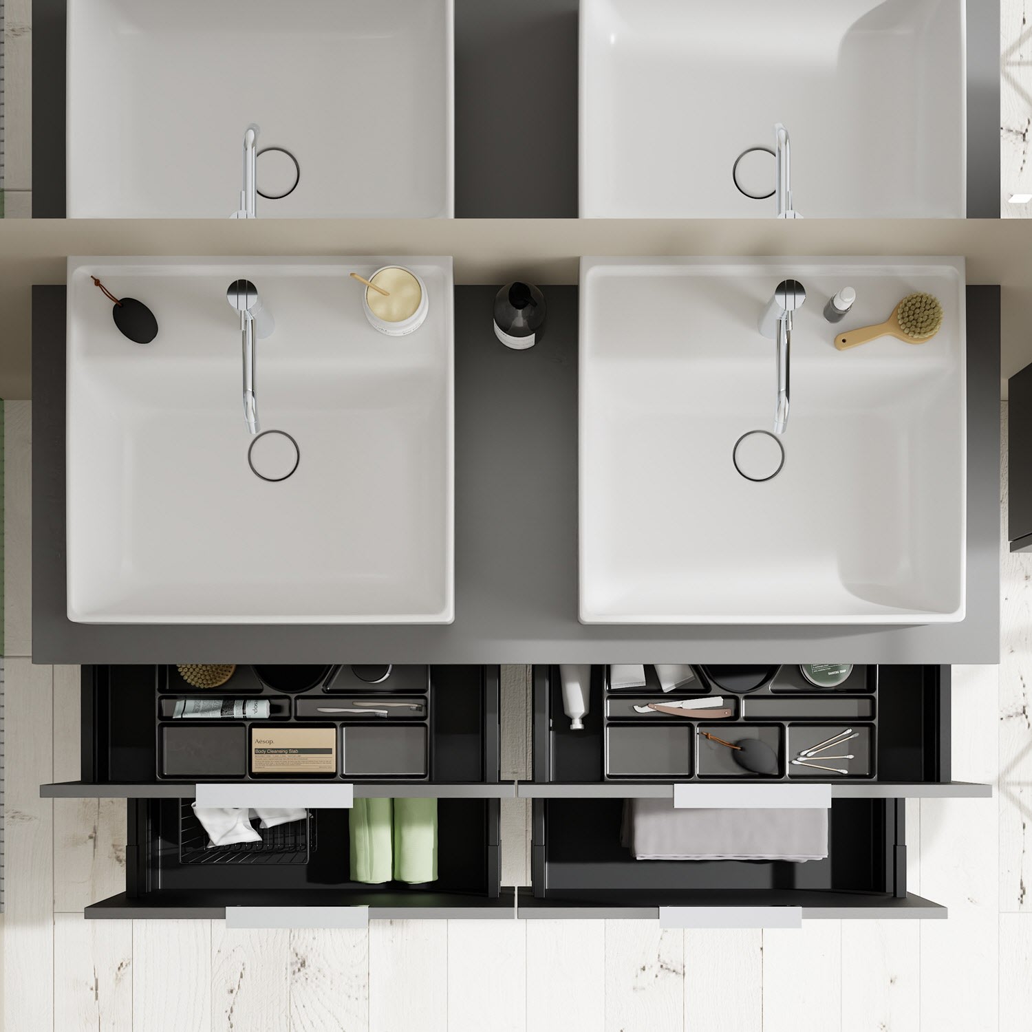 - 2 Schubladen oben, 35 cm tief, mit Siphonausschnitt und Inneneinteilung