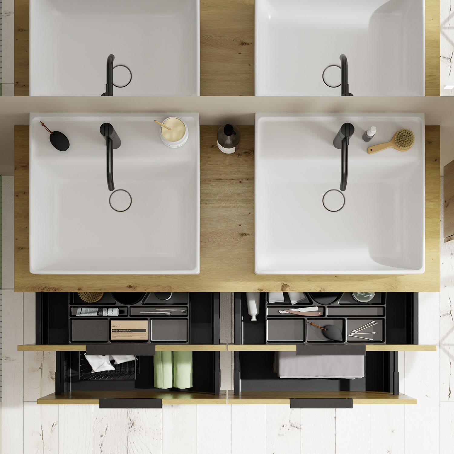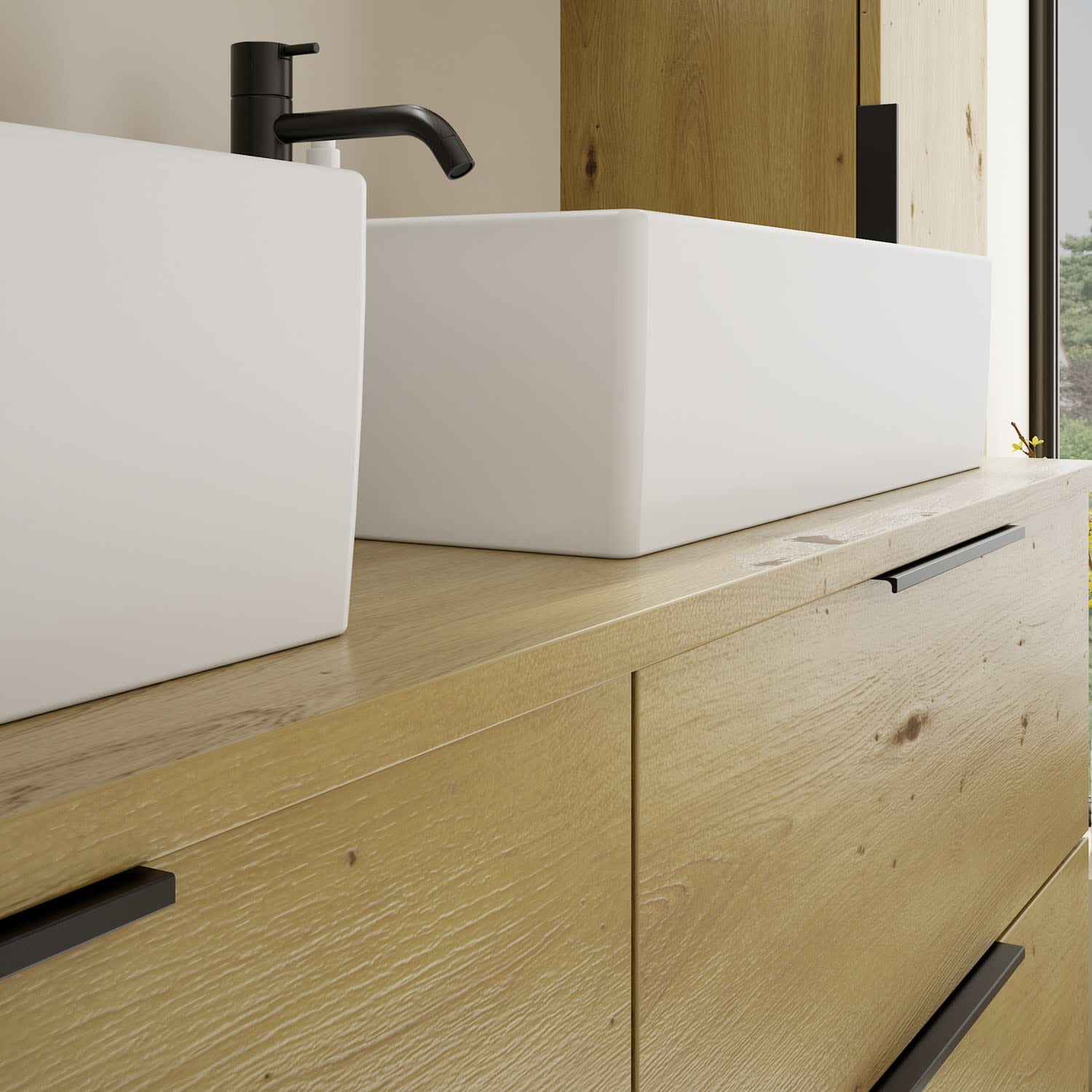 - 2 Schubladen oben, 35 cm tief, mit Siphonausschnitt und Inneneinteilung