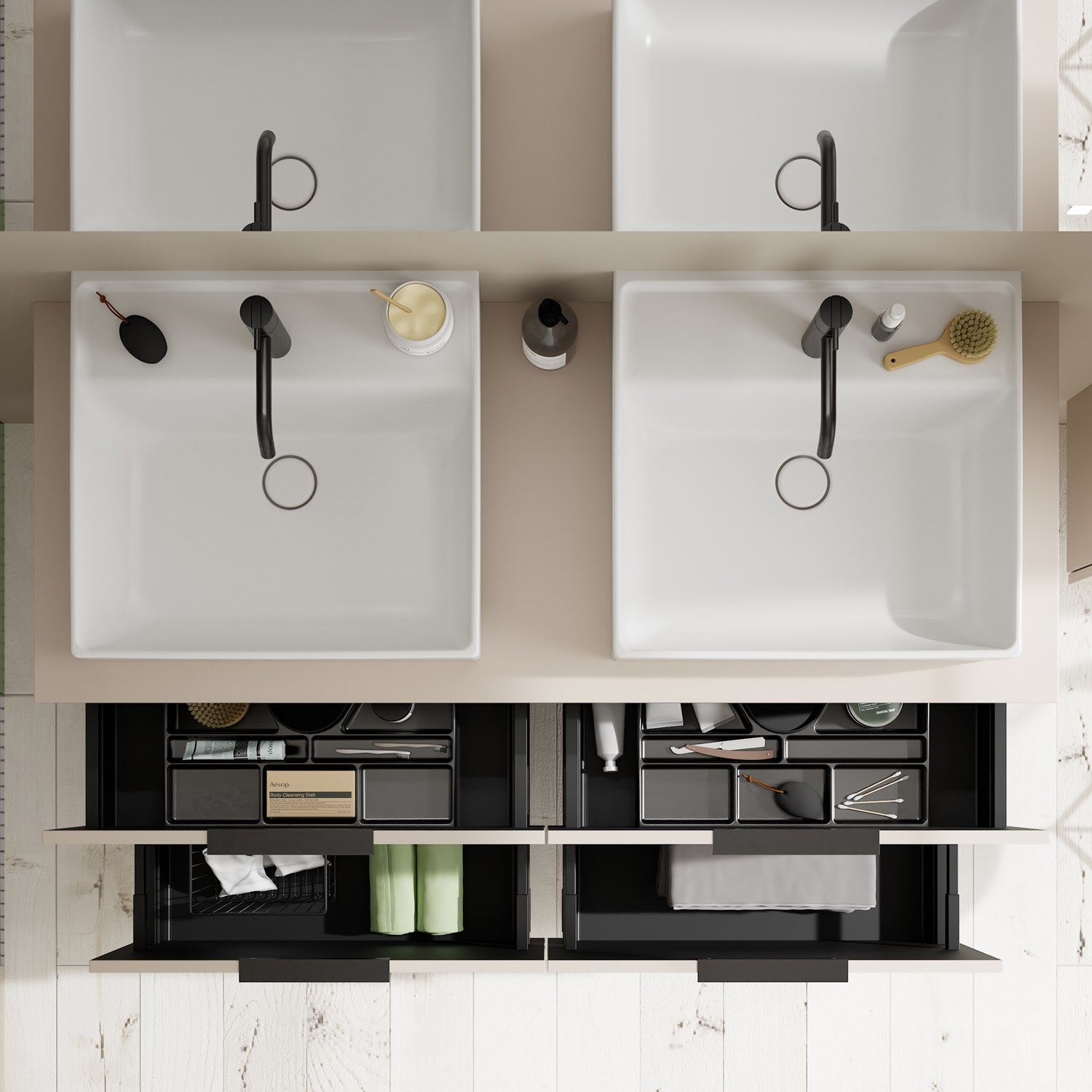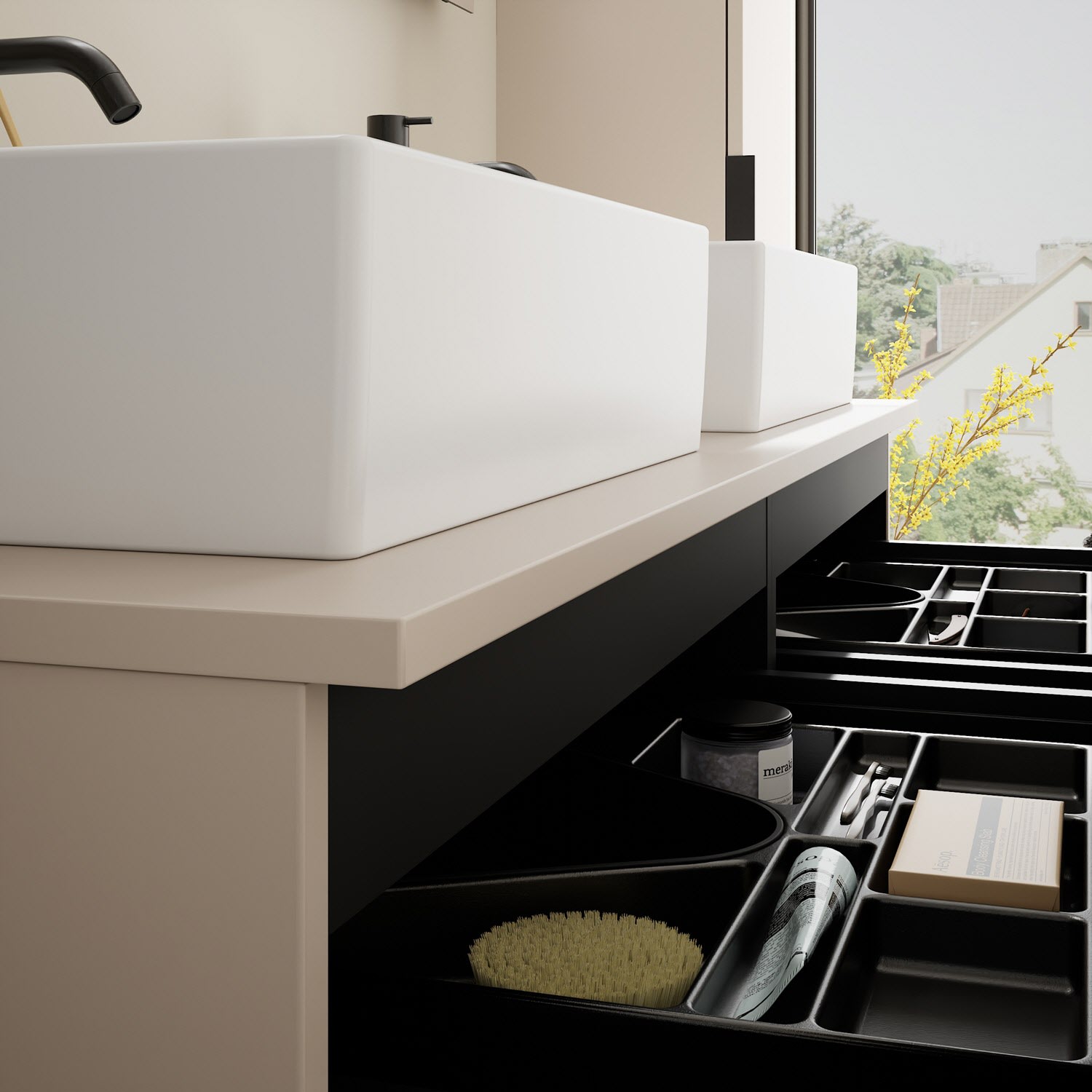 - 2 Schubladen oben, 35 cm tief, mit Siphonausschnitt und Inneneinteilung