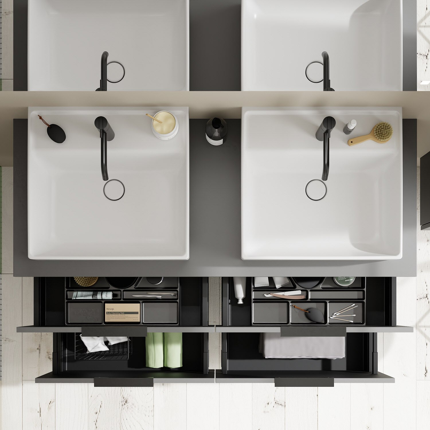 - 2 Schubladen oben, 35 cm tief, mit Siphonausschnitt und Inneneinteilung