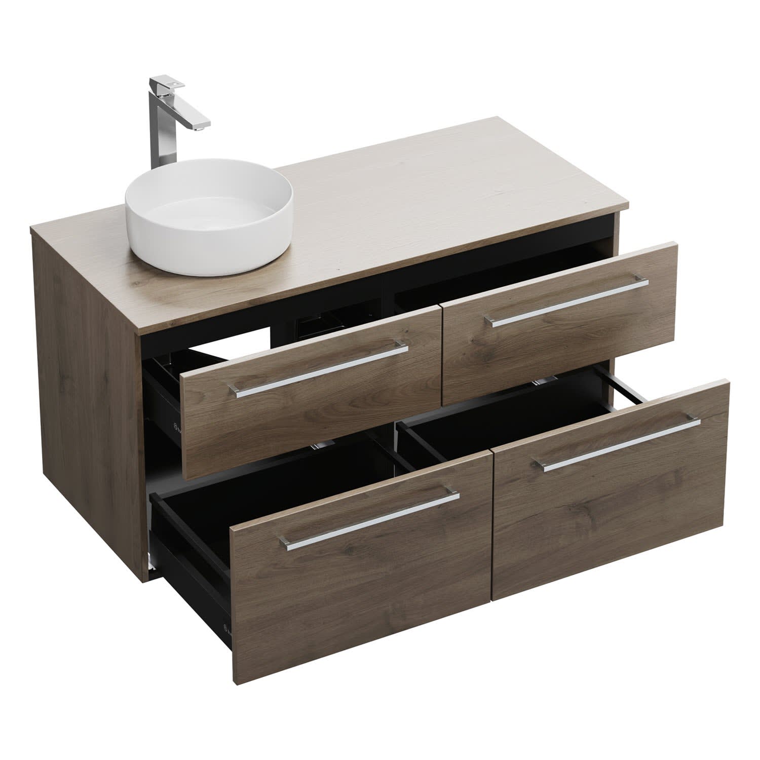 - 2 Schubladen oben, 35 cm tief, mit Siphonausschnitt und Inneneinteilung