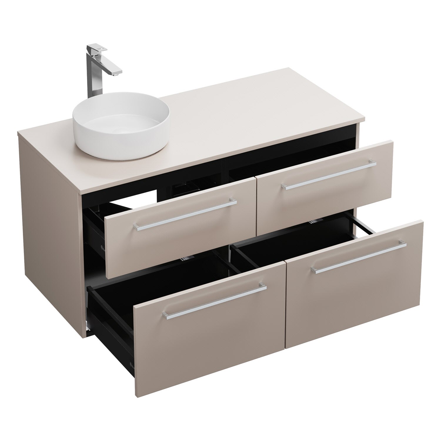 - 2 Schubladen oben, 35 cm tief, mit Siphonausschnitt und Inneneinteilung