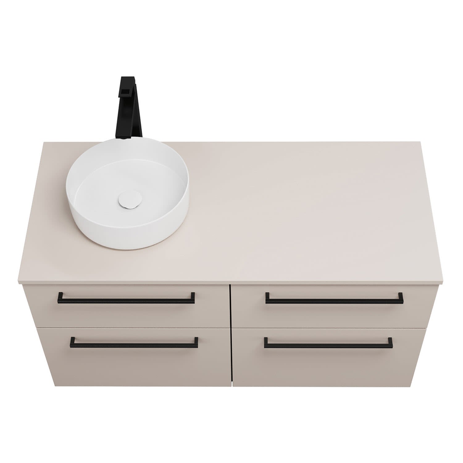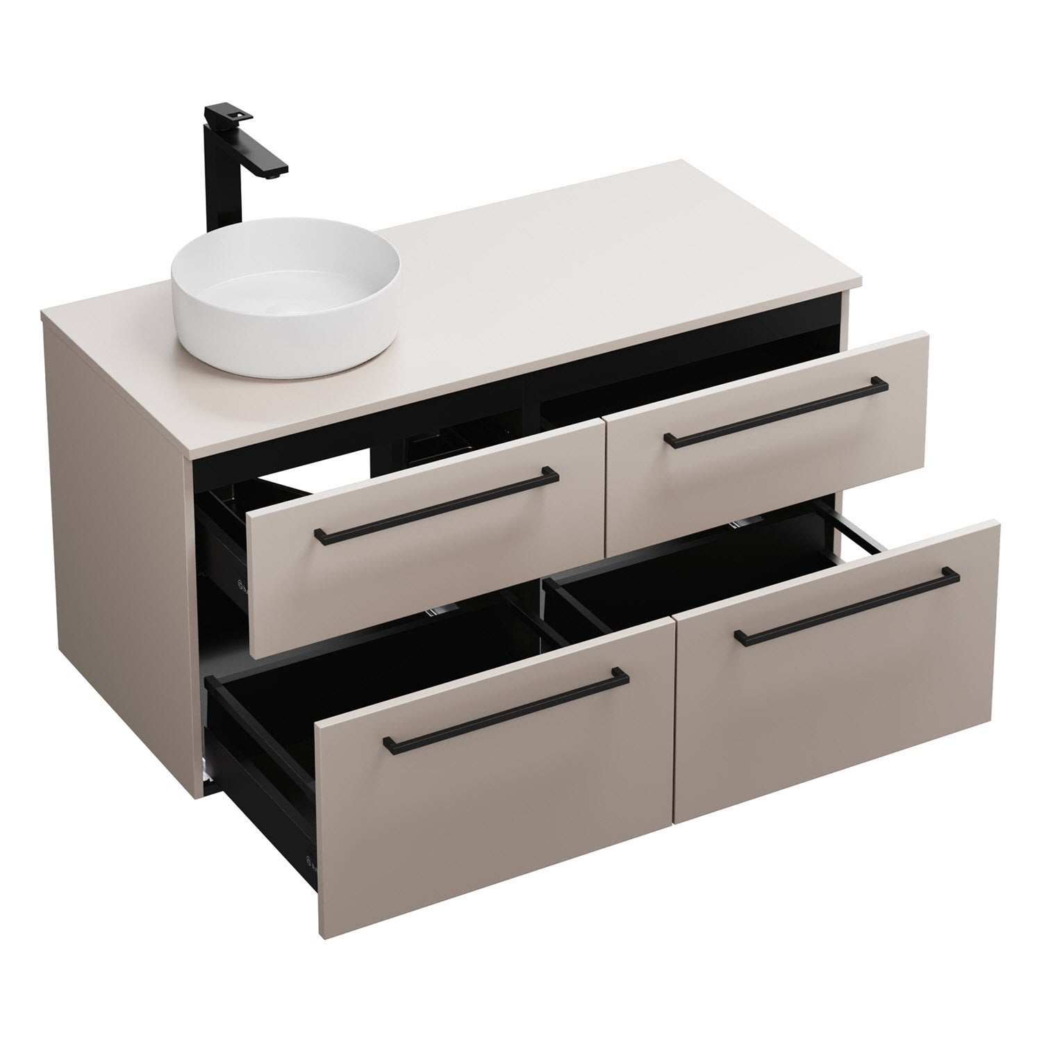 - 2 Schubladen oben, 35 cm tief, mit Siphonausschnitt und Inneneinteilung