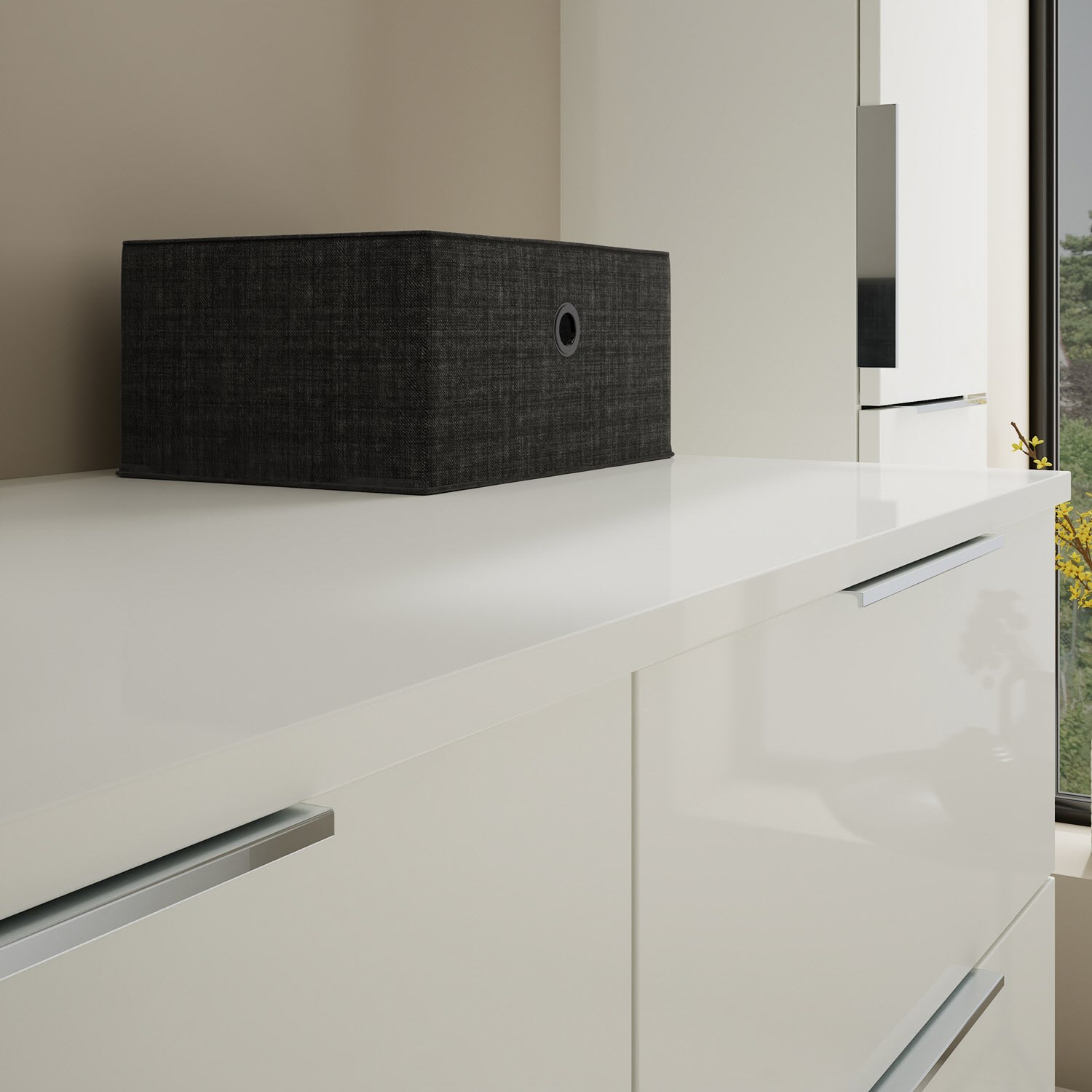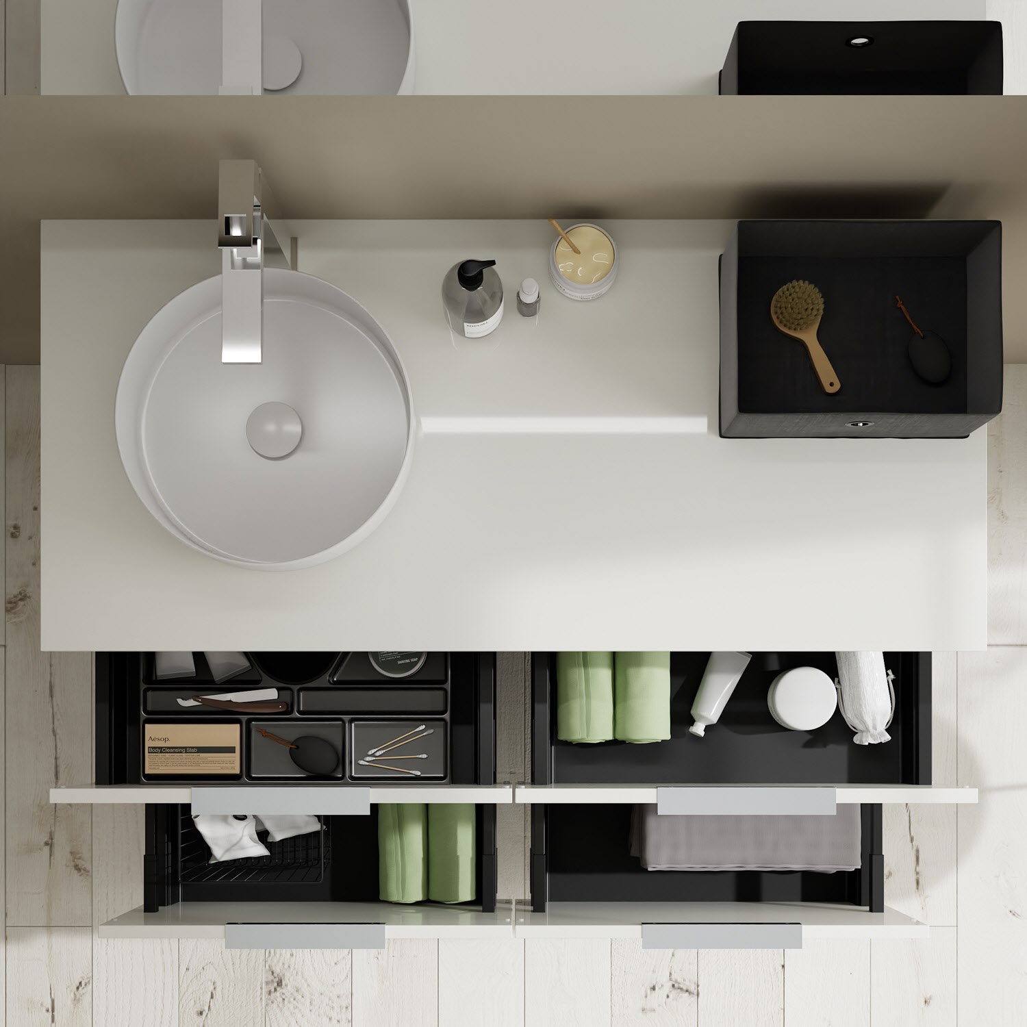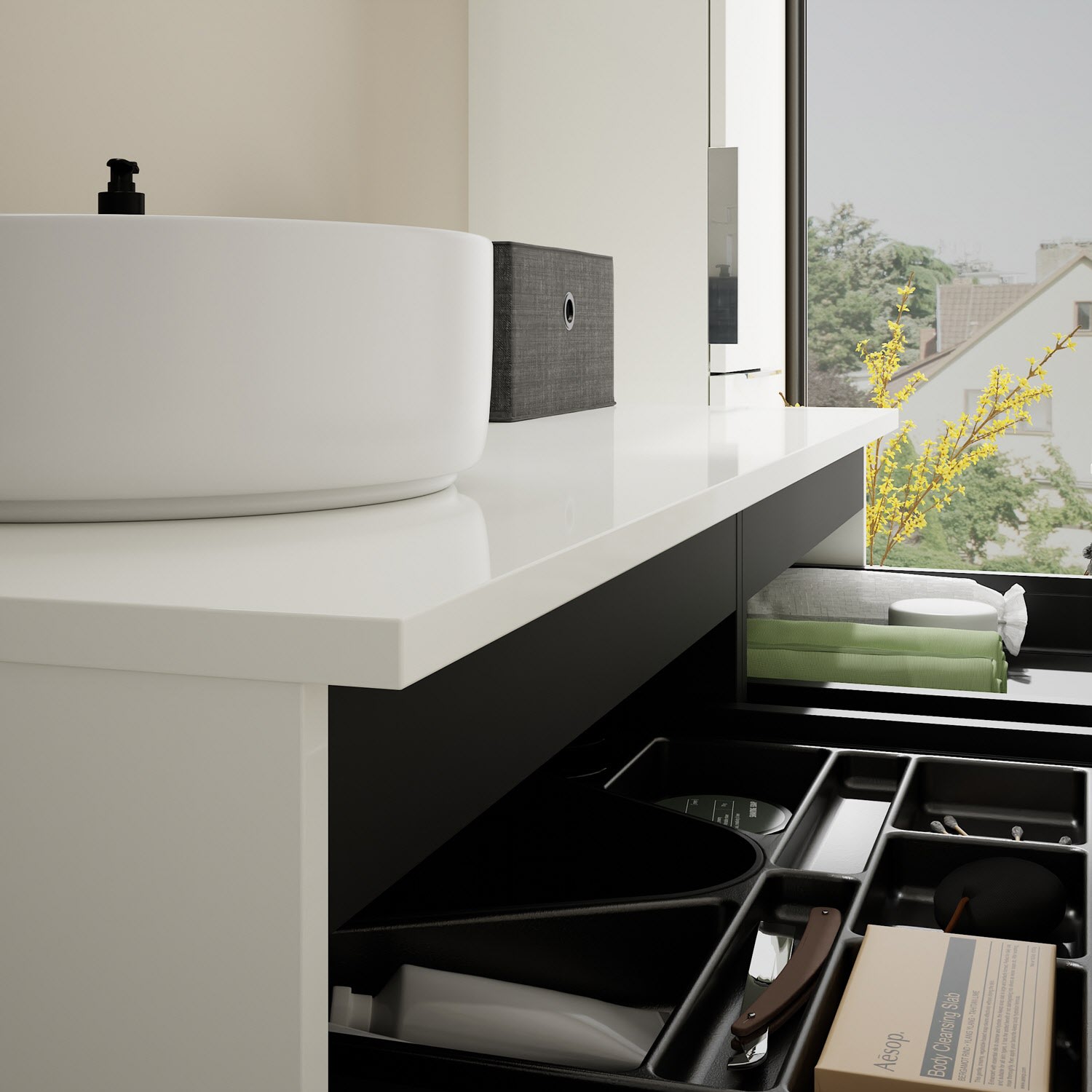 - 2 Schubladen oben, 35 cm tief, mit Siphonausschnitt und Inneneinteilung