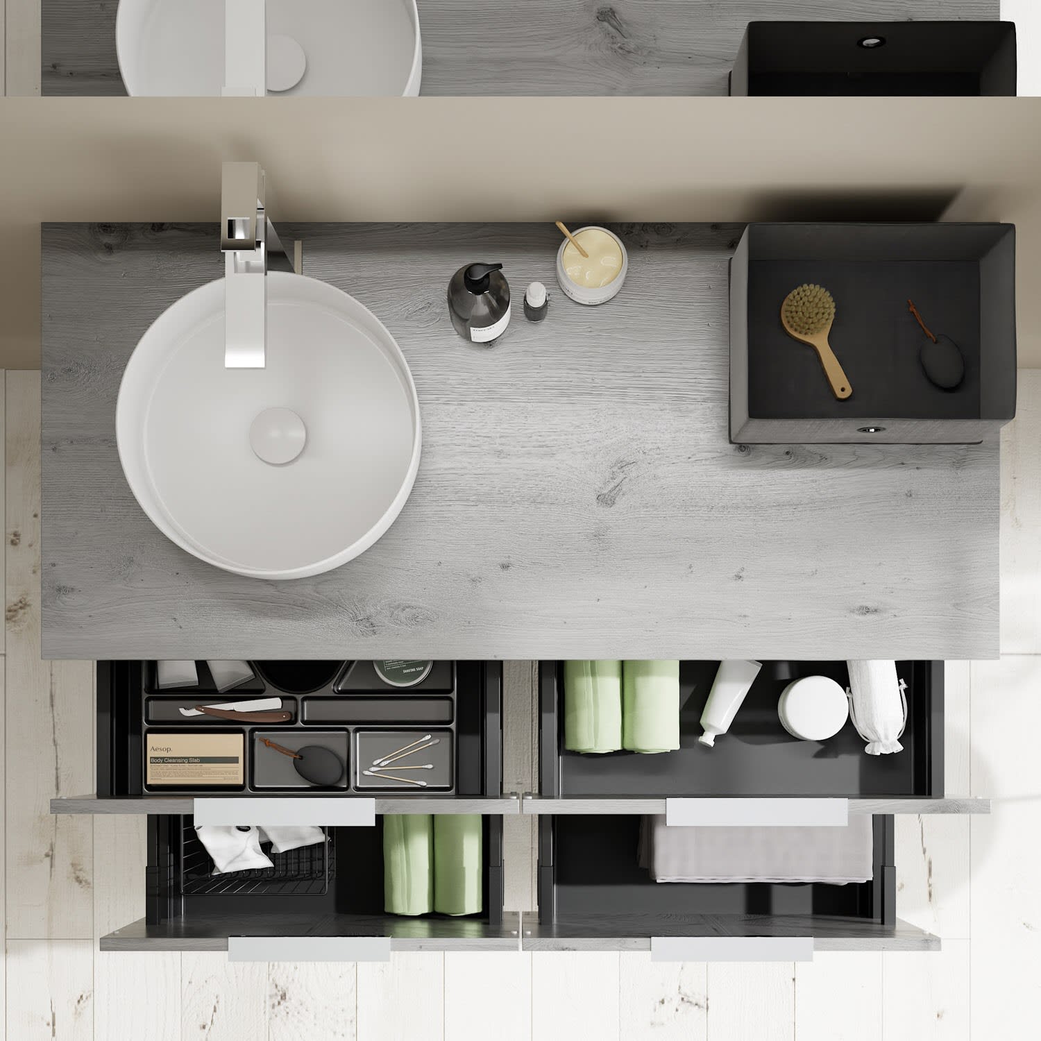 - 2 Schubladen oben, 35 cm tief, mit Siphonausschnitt und Inneneinteilung