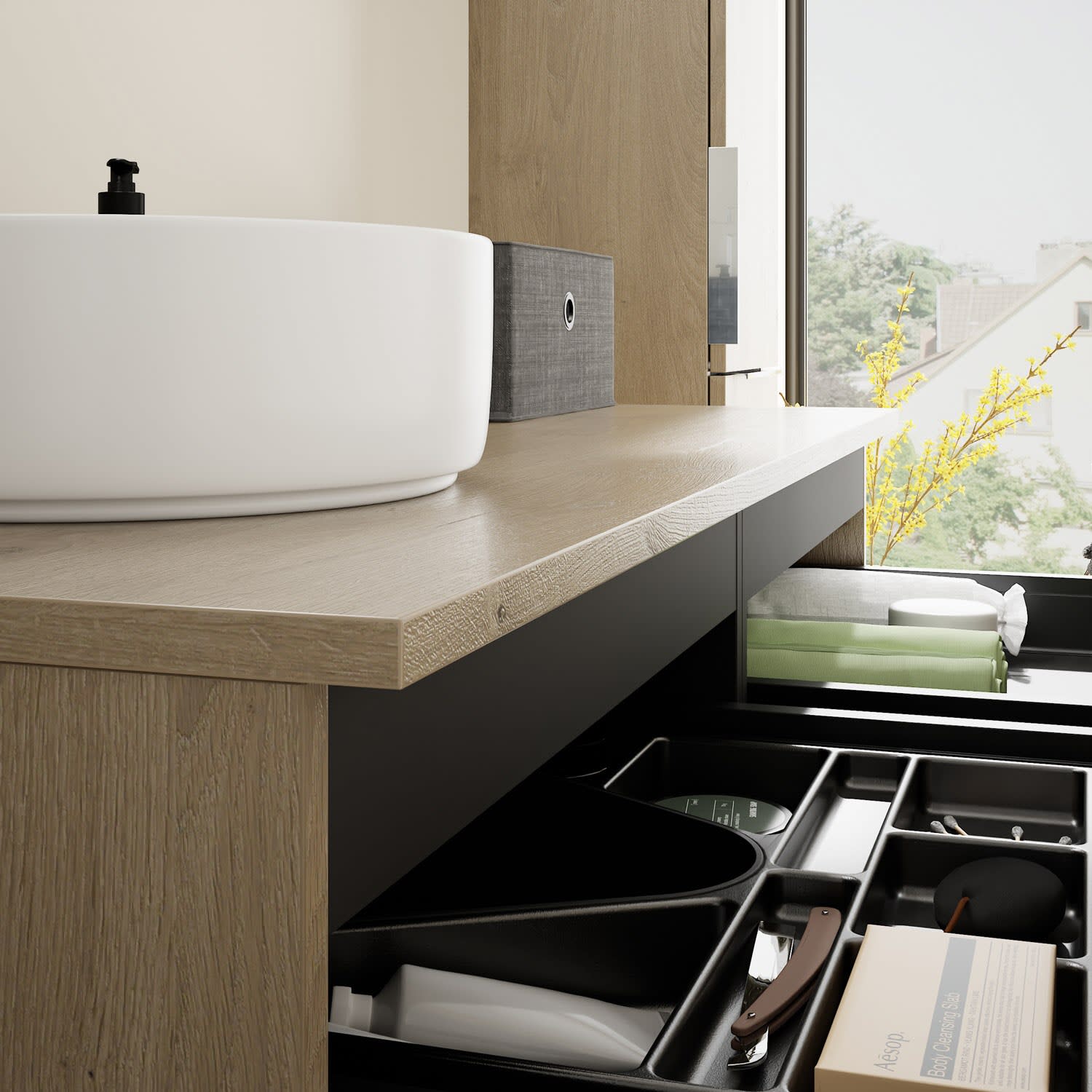 - 2 Schubladen oben, 35 cm tief, mit Siphonausschnitt und Inneneinteilung