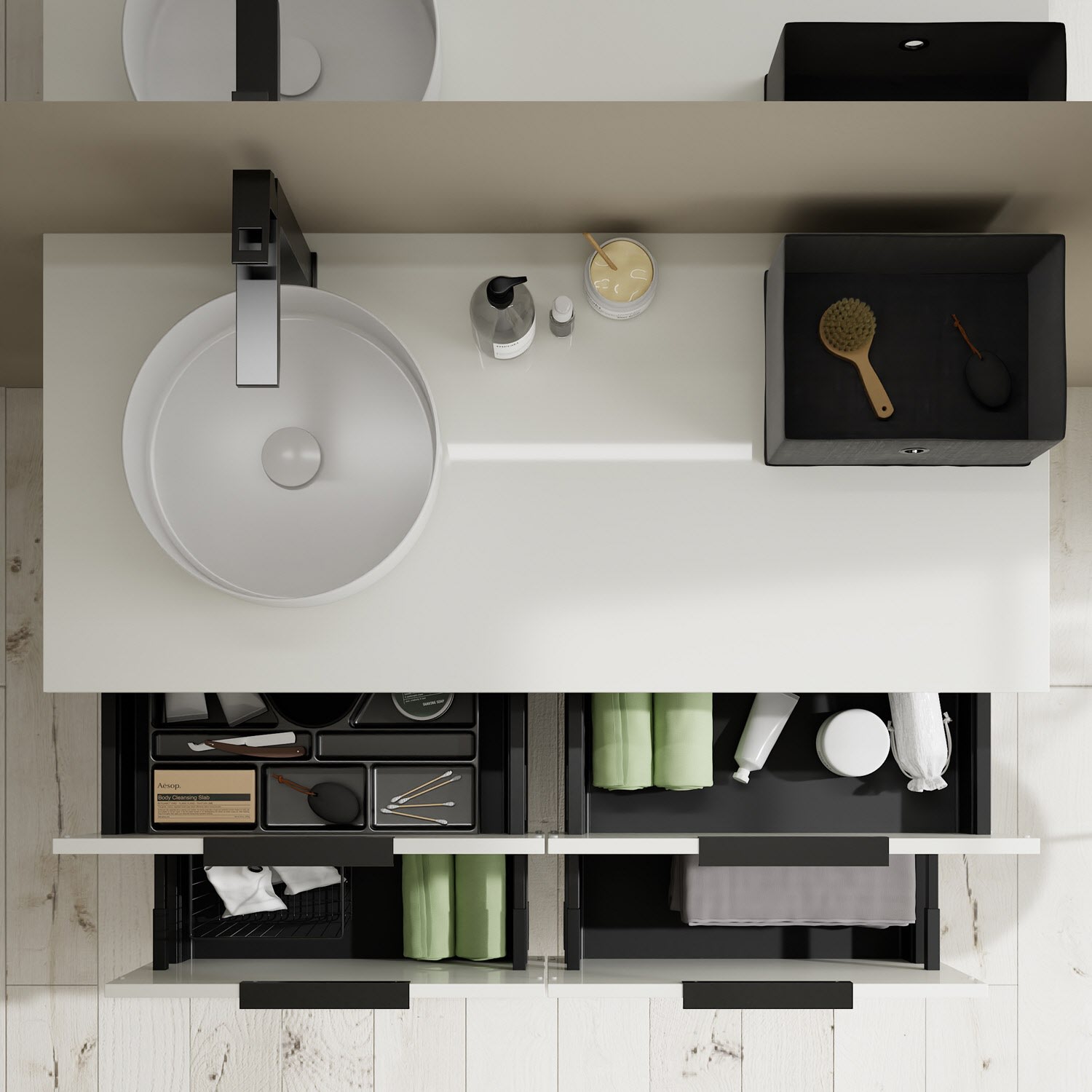 - 2 Schubladen oben, 35 cm tief, mit Siphonausschnitt und Inneneinteilung