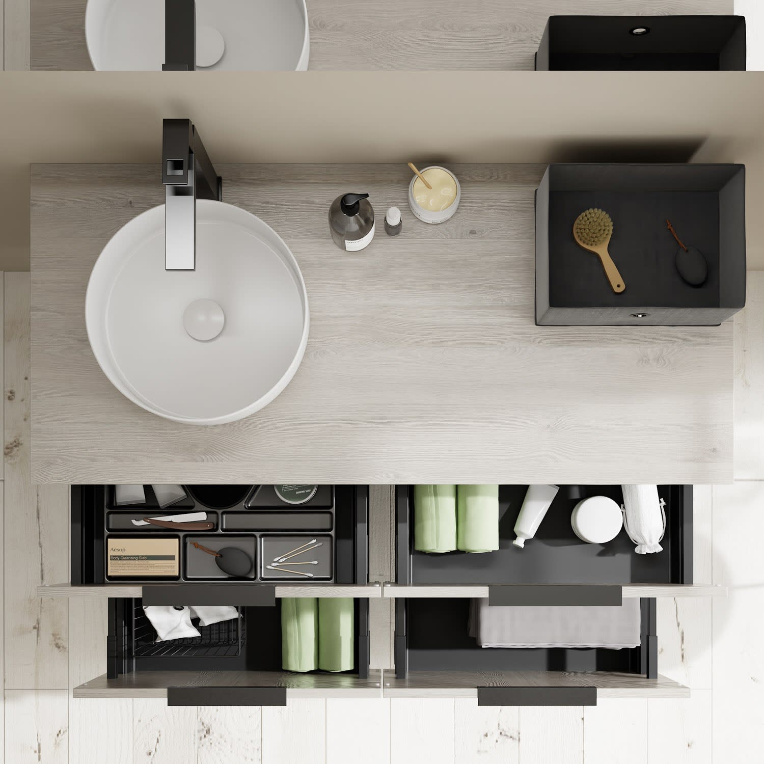 - 2 Schubladen oben, 35 cm tief, mit Siphonausschnitt und Inneneinteilung