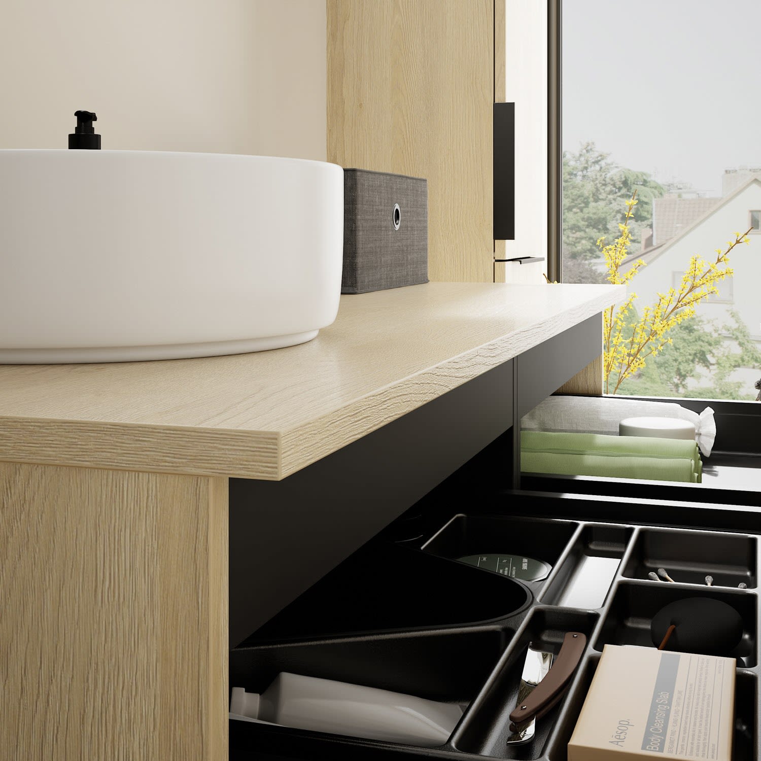 - 2 Schubladen oben, 35 cm tief, mit Siphonausschnitt und Inneneinteilung