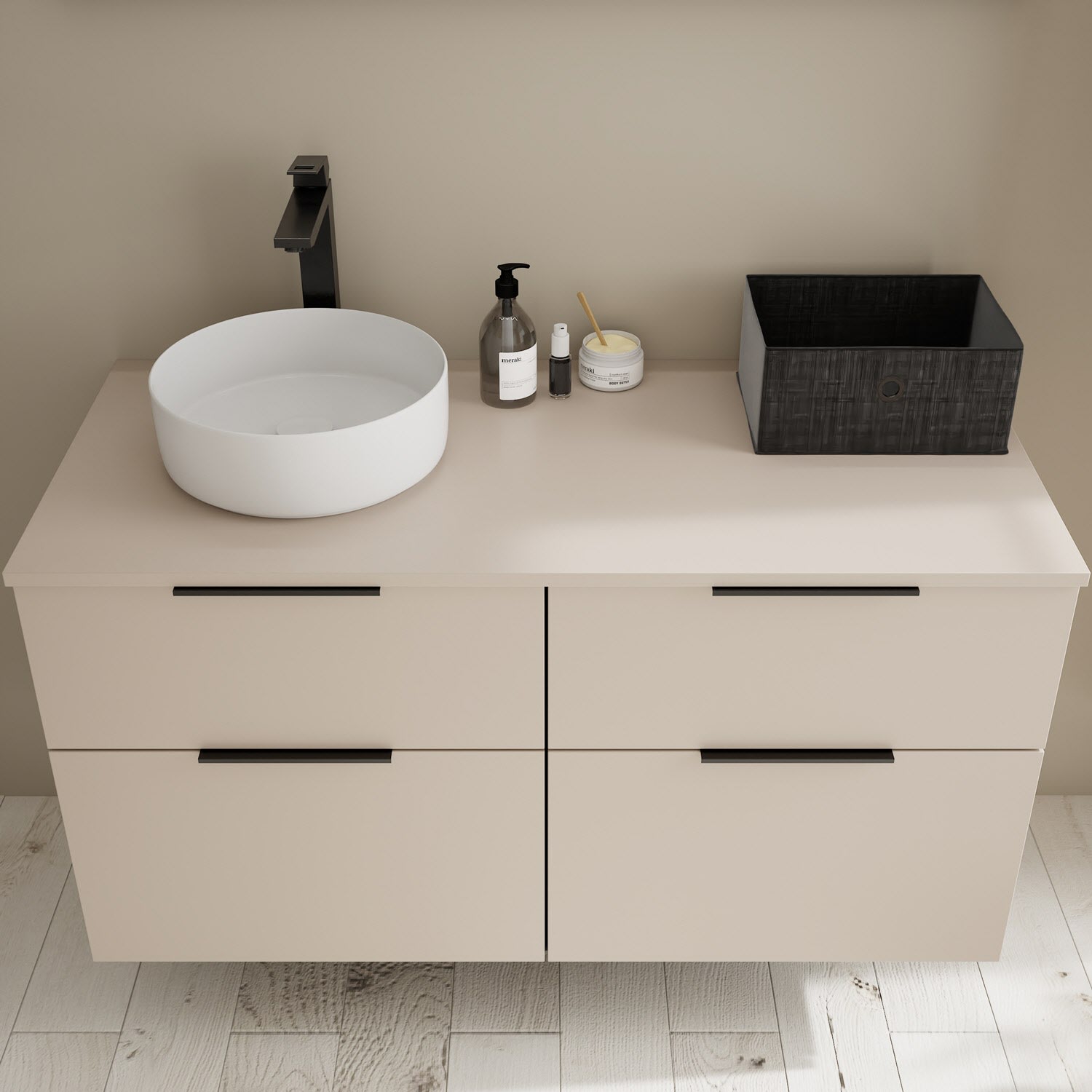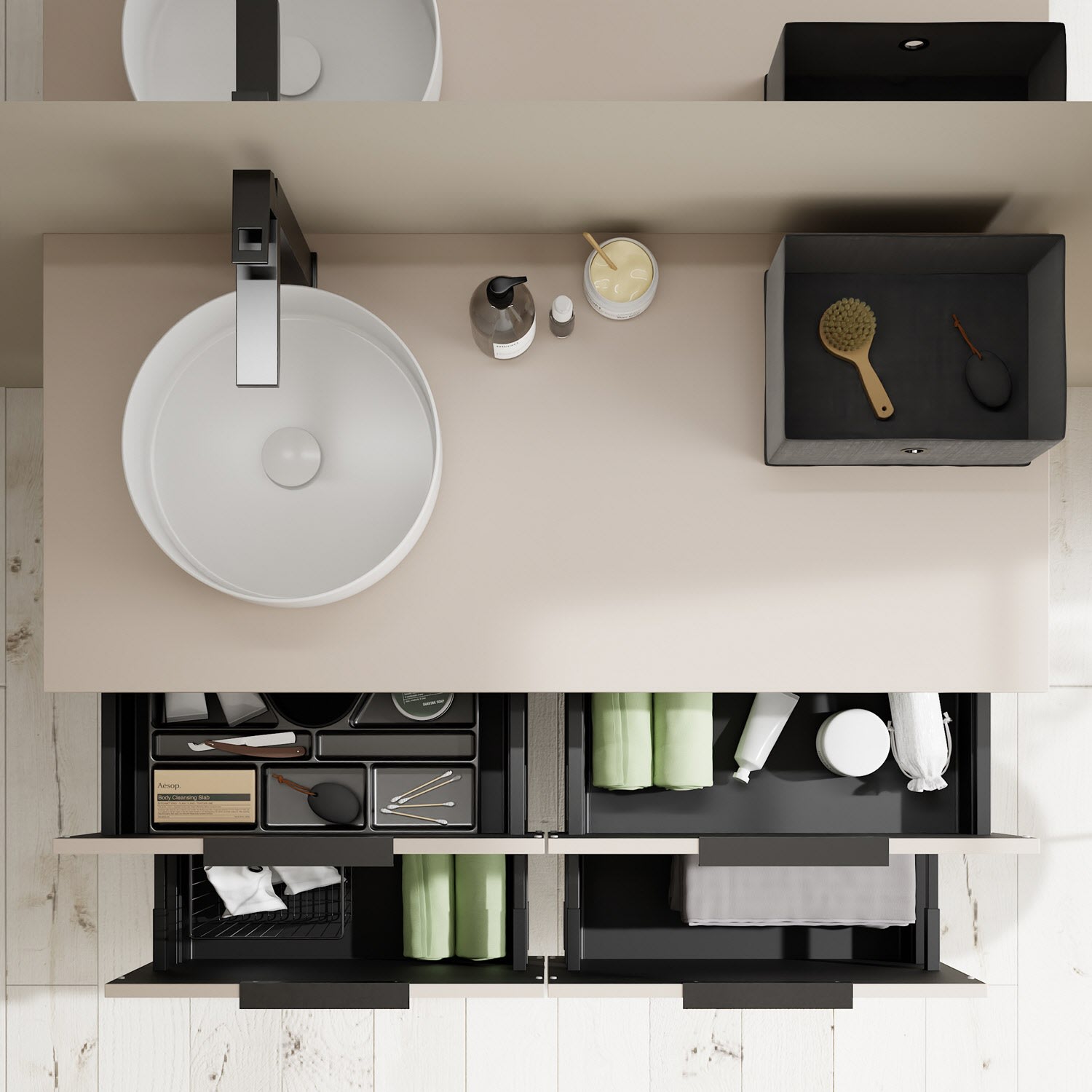 - 2 Schubladen oben, 35 cm tief, mit Siphonausschnitt und Inneneinteilung