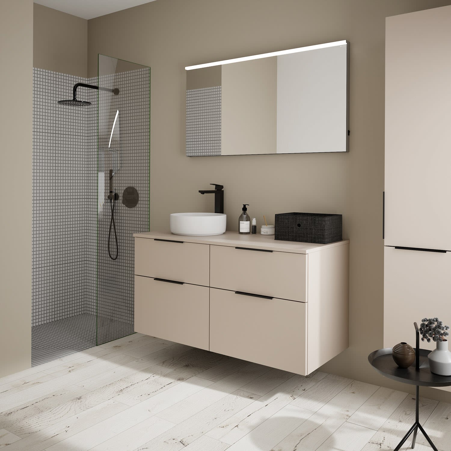 burgbad Eqio Waschtischkombination mit Keramik-Aufsatzwaschtisch 120 cm, links, mit Griff G0200