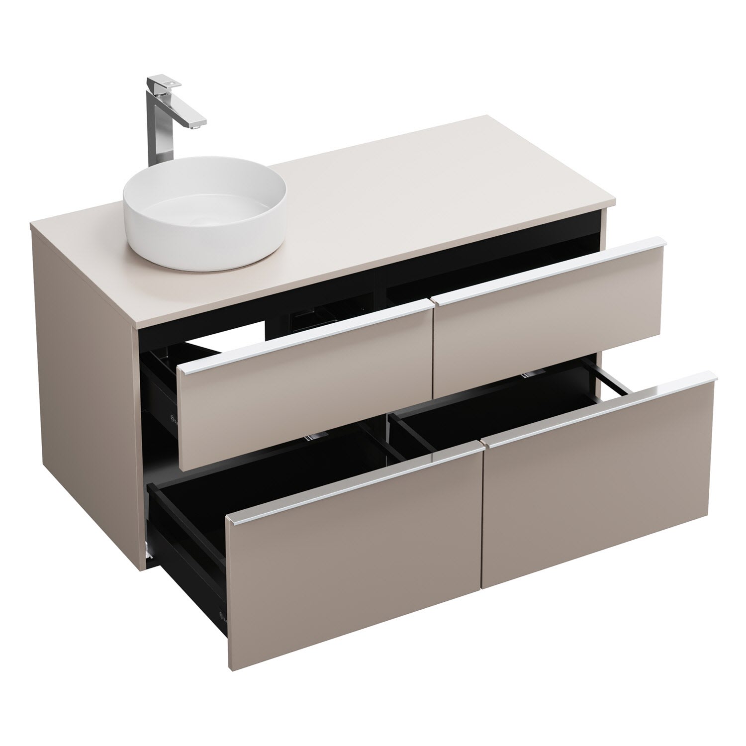 - 2 Schubladen oben, 35 cm tief, mit Siphonausschnitt und Inneneinteilung