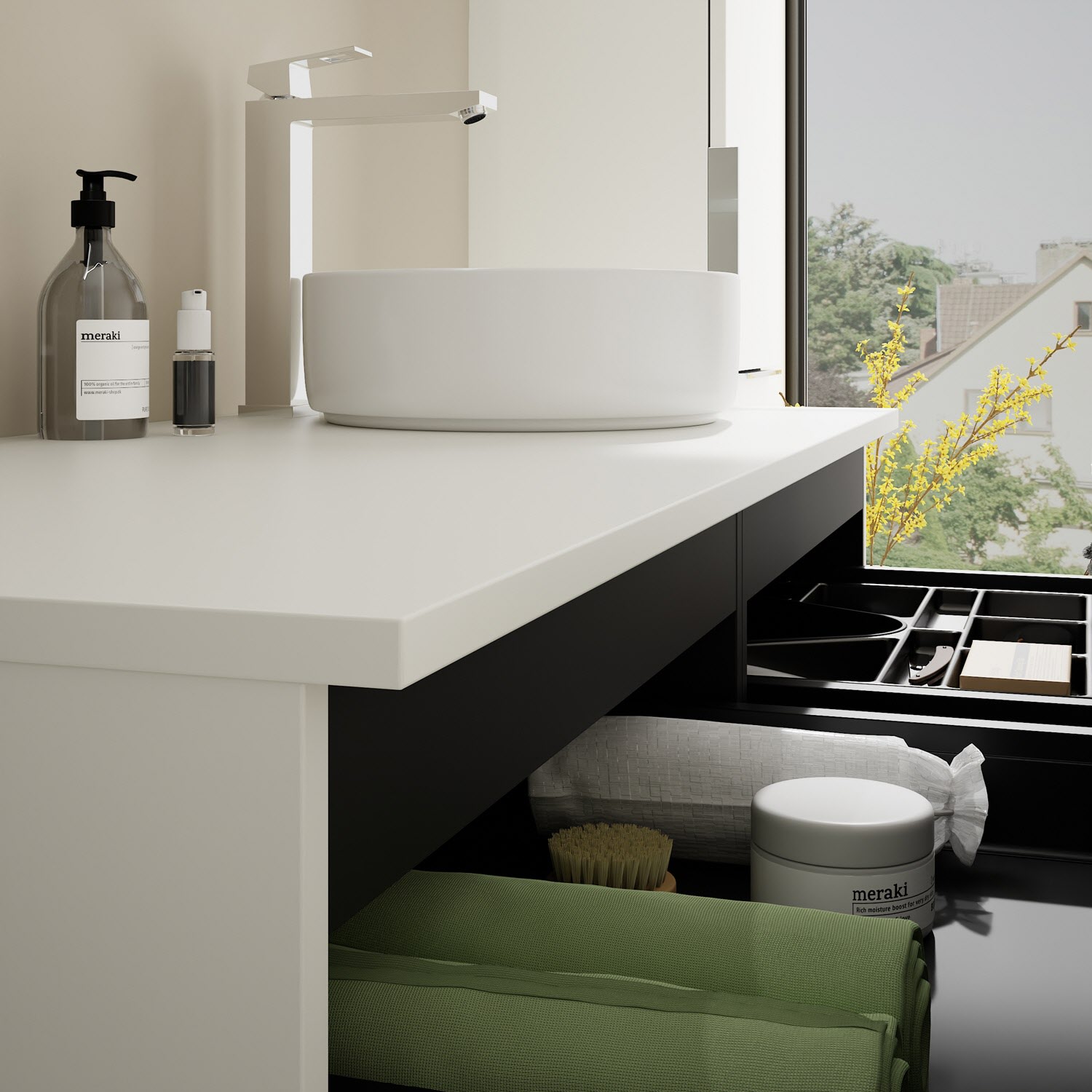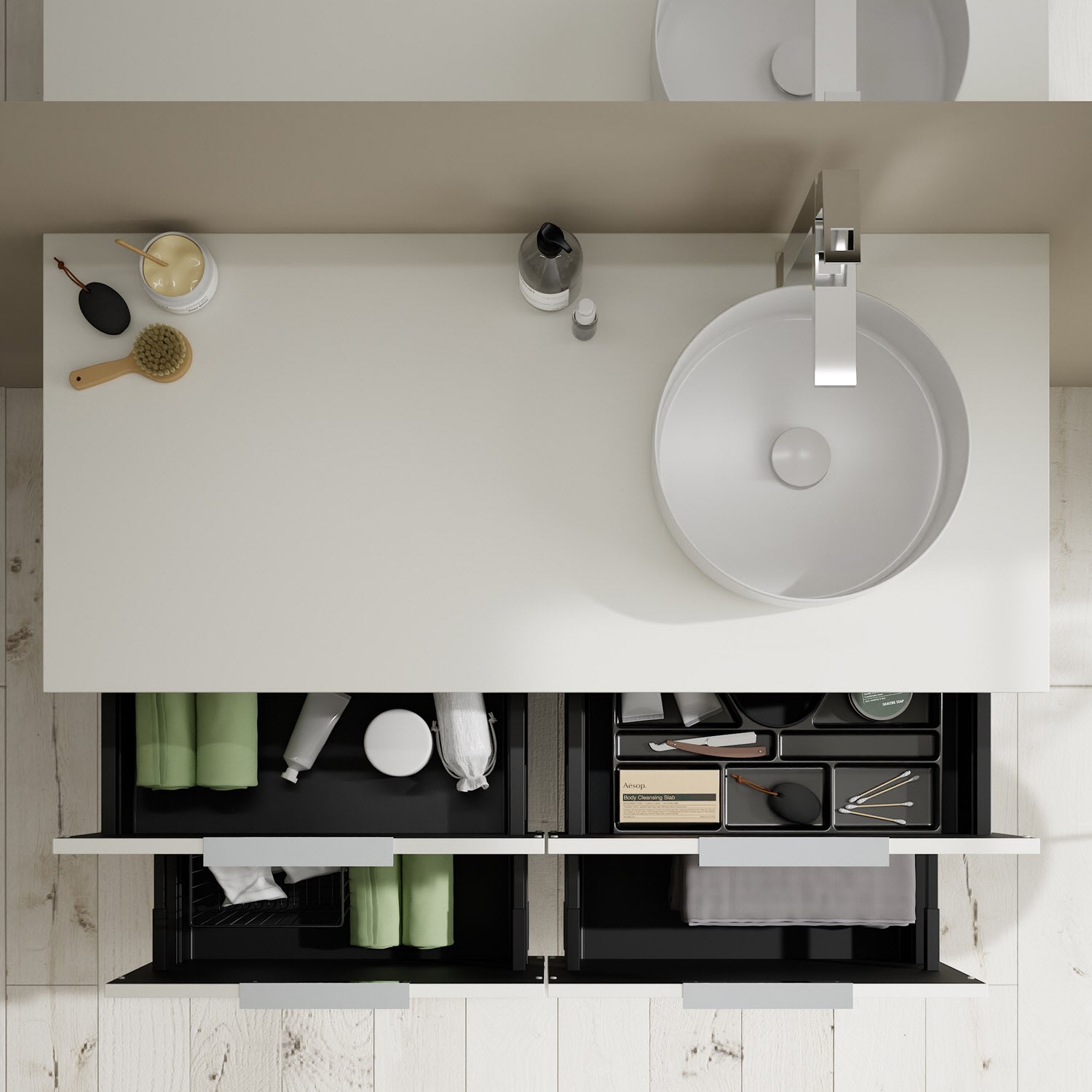 - 2 Schubladen oben, 35 cm tief, mit Siphonausschnitt und Inneneinteilung