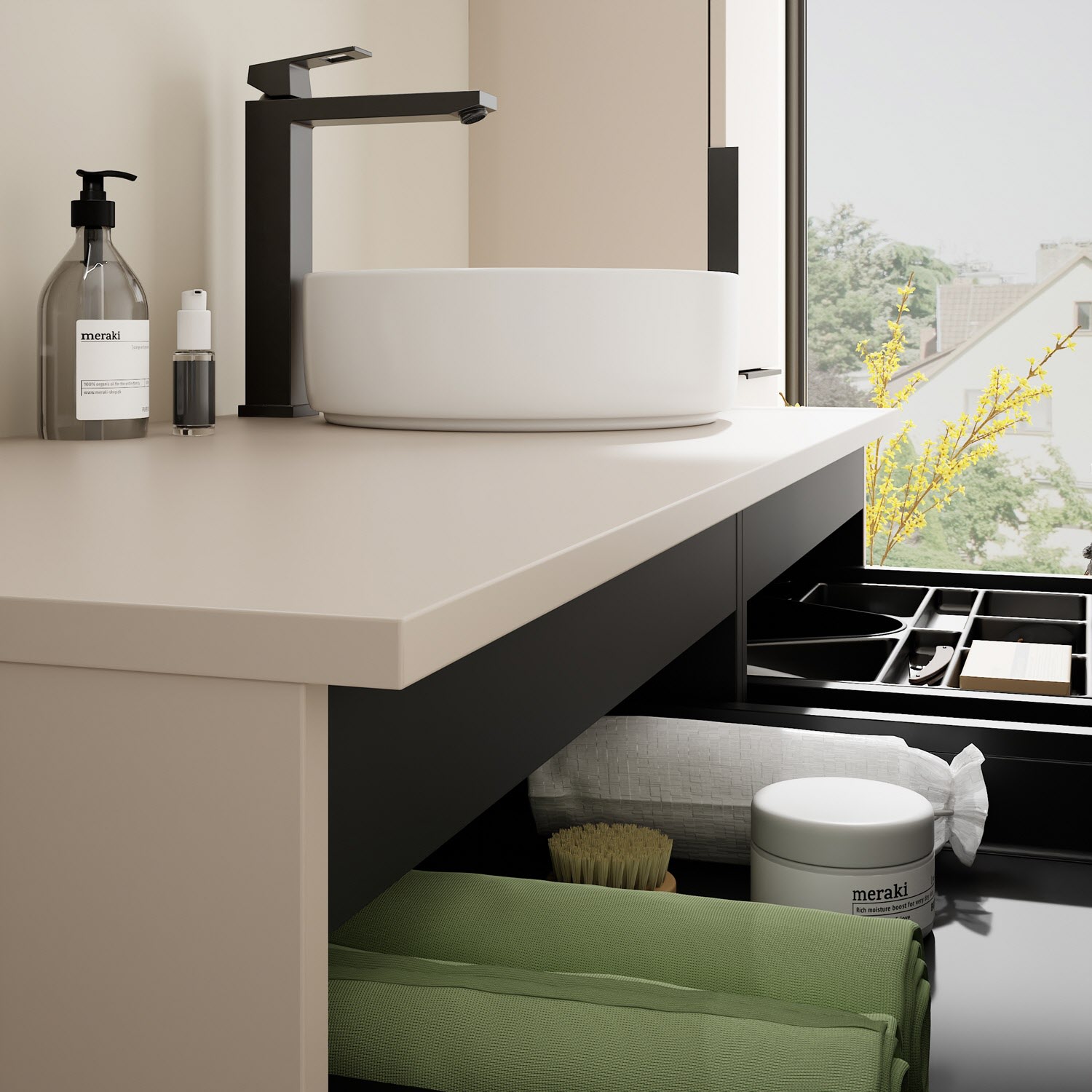 - 2 Schubladen oben, 35 cm tief, mit Siphonausschnitt und Inneneinteilung