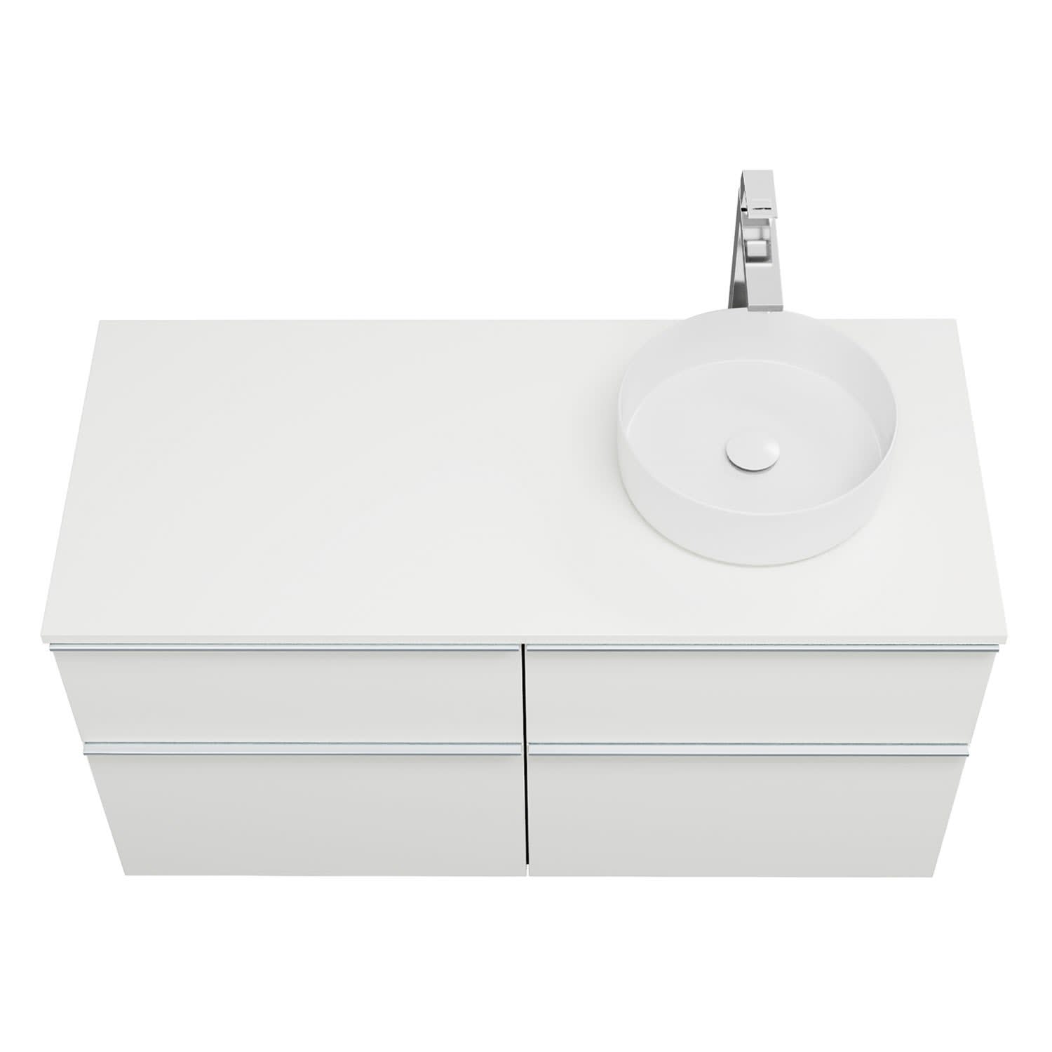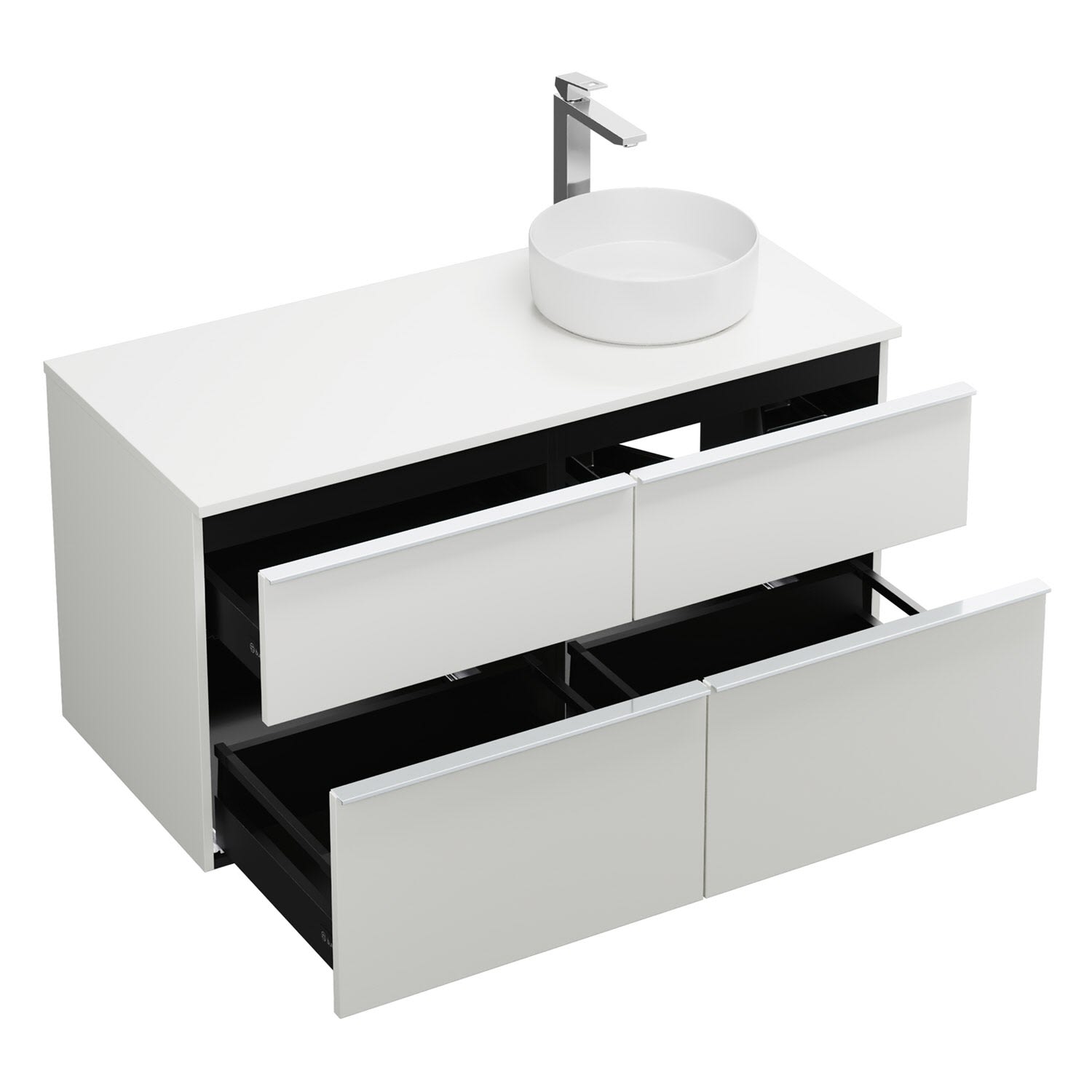 - 2 Schubladen oben, 35 cm tief, mit Siphonausschnitt und Inneneinteilung