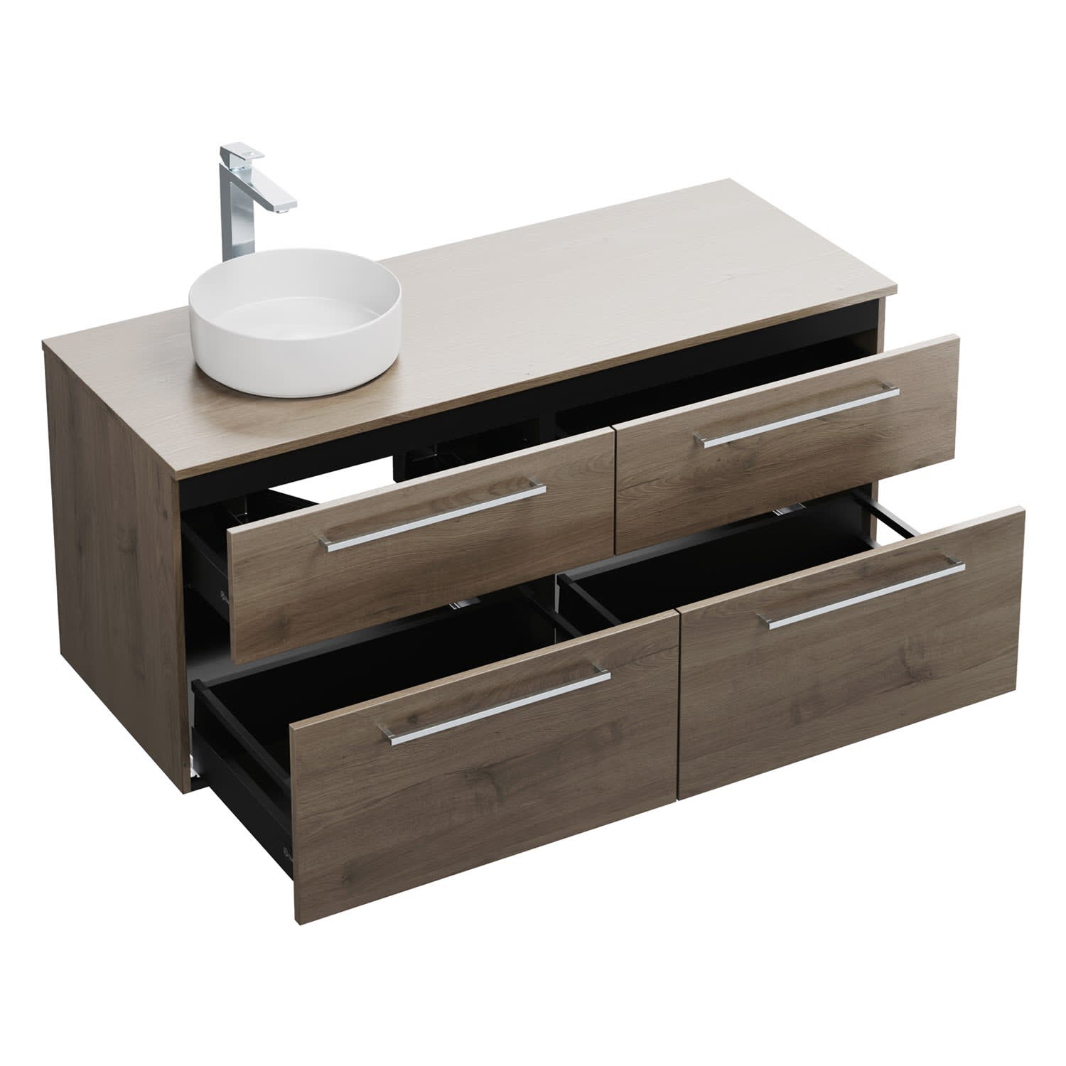 - 2 Schubladen oben, 35 cm tief, mit Siphonausschnitt und Inneneinteilung
